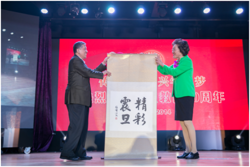 原上海市教委主任张伟江向“震旦教育”集团董事长、管委会主任张惠莉赠送墨宝“震旦精神”祝贺震旦教育三十周年。