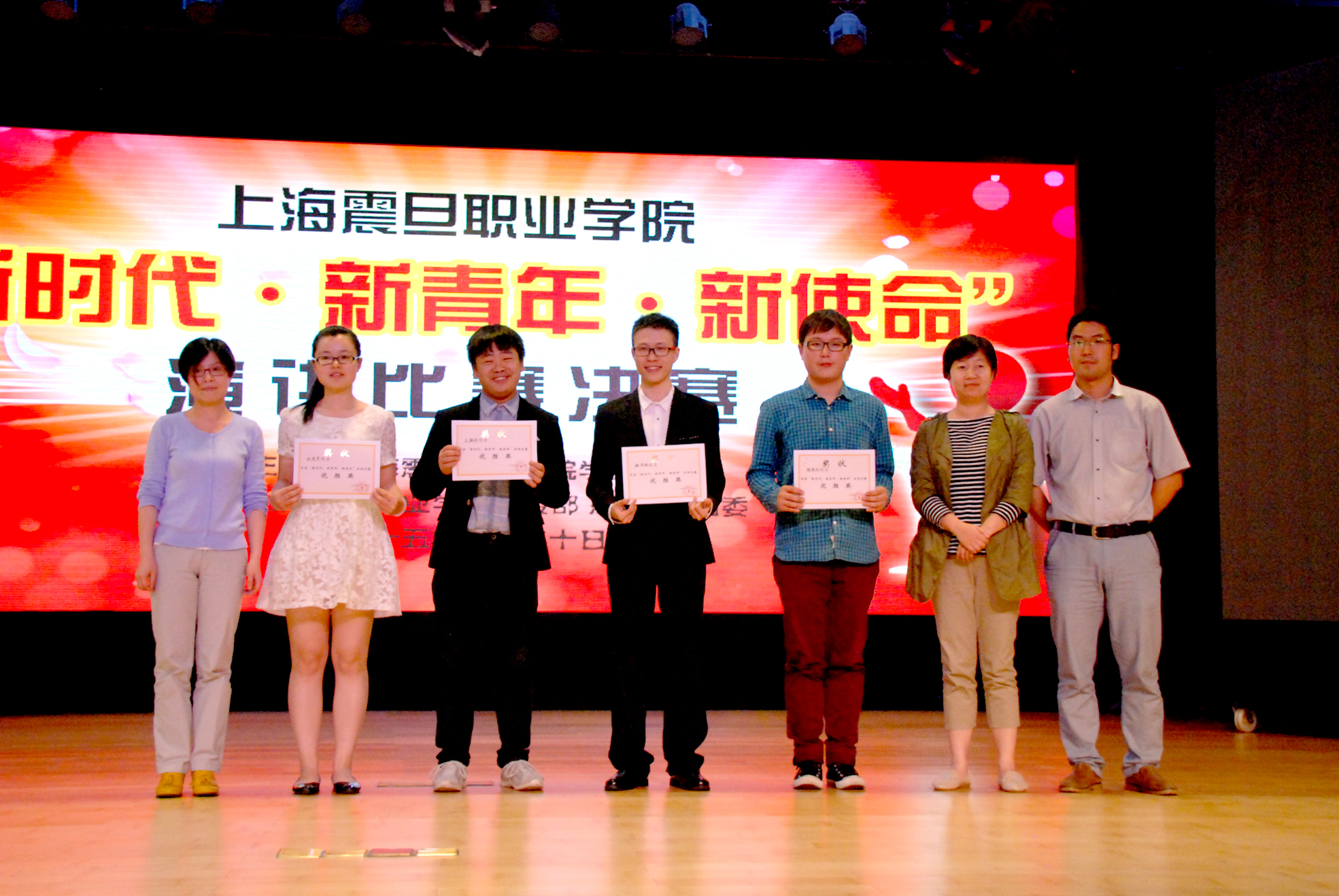 最终比赛结果揭晓,获得优秀奖的是:14新闻杨俊杰、14机电顾家络、14会计2班沈亮亮、14音像王勤政。获得三等奖:14护理1班王文锦、14建筑周玉珠、14广告朱书晴。获得二等奖:14护理4班王蓓、14英语崔佳佳。众望所归一等奖的得主是14护理应雨晨同学,她热情洋溢,毫不怯场的表现打动了在场的每一个人。