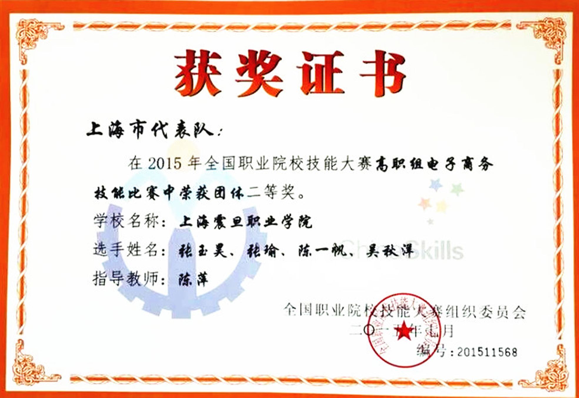 我校代表队荣获 2015 年全国职业院校技能大赛高职组电子商务技能比赛团体二等奖。 7 月 2日,我校机电工程学院物联网技术专业和计算机多媒体技术专业的张玉昊、张瑜、陈一帆、吴秋洋四位同学在陈萍老师指导下,以上海市选拔赛第一名的成绩代表上海市高职院校参加全国比赛。经过6 个小时比赛的激烈拼搏,在全国 77个团队中脱颖而出,荣获团体二等奖,在数个上海代表队中名列第一。这是我校在全国职业技能竞赛中的重大突破!