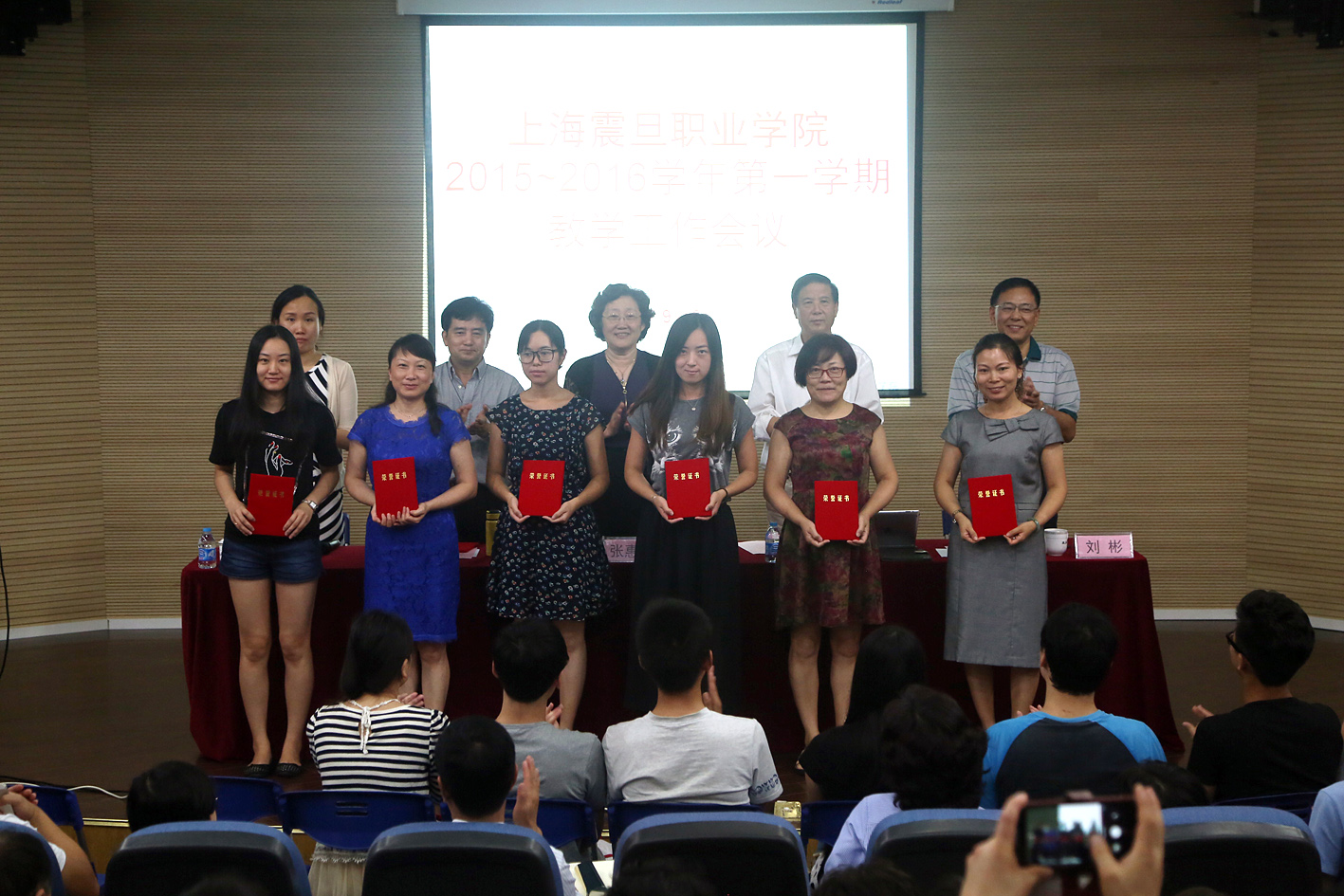 会议由院长助理张沈宣读了 2015 年职业技能竞赛的获奖名单,获奖师生在全体教职工热烈的掌声中上台接受了院领导颁发的荣誉证书。他们是获得 2015 年全国职业院校技能大赛高职组“电子商务技能”选拔赛团体二等奖、全国职业院校技能大赛上海赛区“聚文杯”电子商务技能选拔赛团体一等奖和三等奖,上海市“星光计划 ” 职业技能竞赛非英语专业口语比赛三等奖、平面设计比赛三等奖、网站设计比赛三等奖的学生和教师。以及第四届院科技节项目比赛获一、二、三等奖的学生和科技节组织奖的学院。会上还颁发了优秀园丁奖和师德标兵奖。