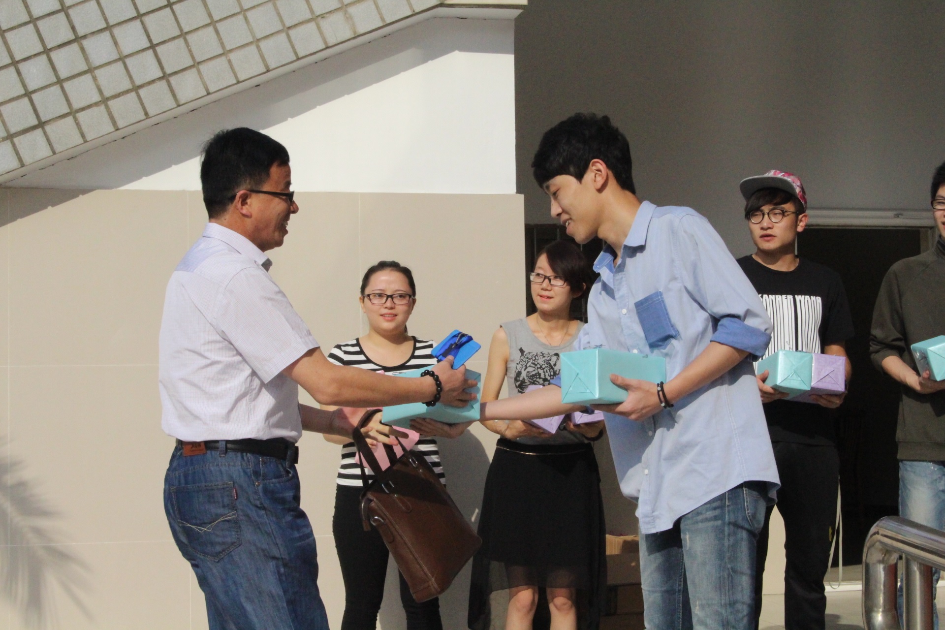 上午8点,学生代表们早早就在教学楼的门口等待老师们的到来,为老师献上祝福的礼物。笔筒贴上祝福的话语,经过同学们精心包裹,亲手送给老师,礼轻却情意重。老师们收到这些礼物的时候,都不由自主地流露出灿烂的笑容。