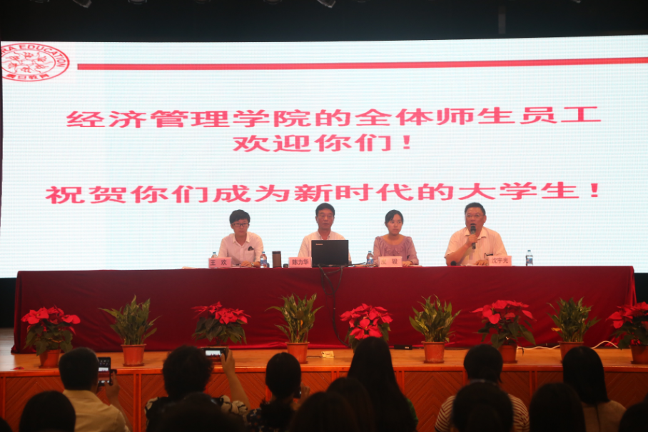 2015年9月16日,经济管理学院2015级新生开学典礼在学校大礼堂举行。出席开学典礼的有震旦职业学院“十三五规划”起草领导小组组长、资深管理学教授——陈力华老师,党总支书记王欢老师,院长助理皮骏老师,以及经济管理学院全体教职工。开学典礼由党总支副书记沈宇光老师主持。