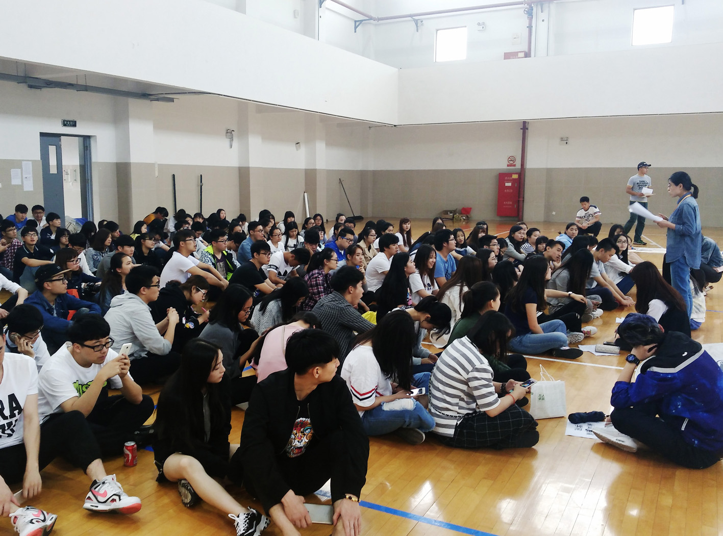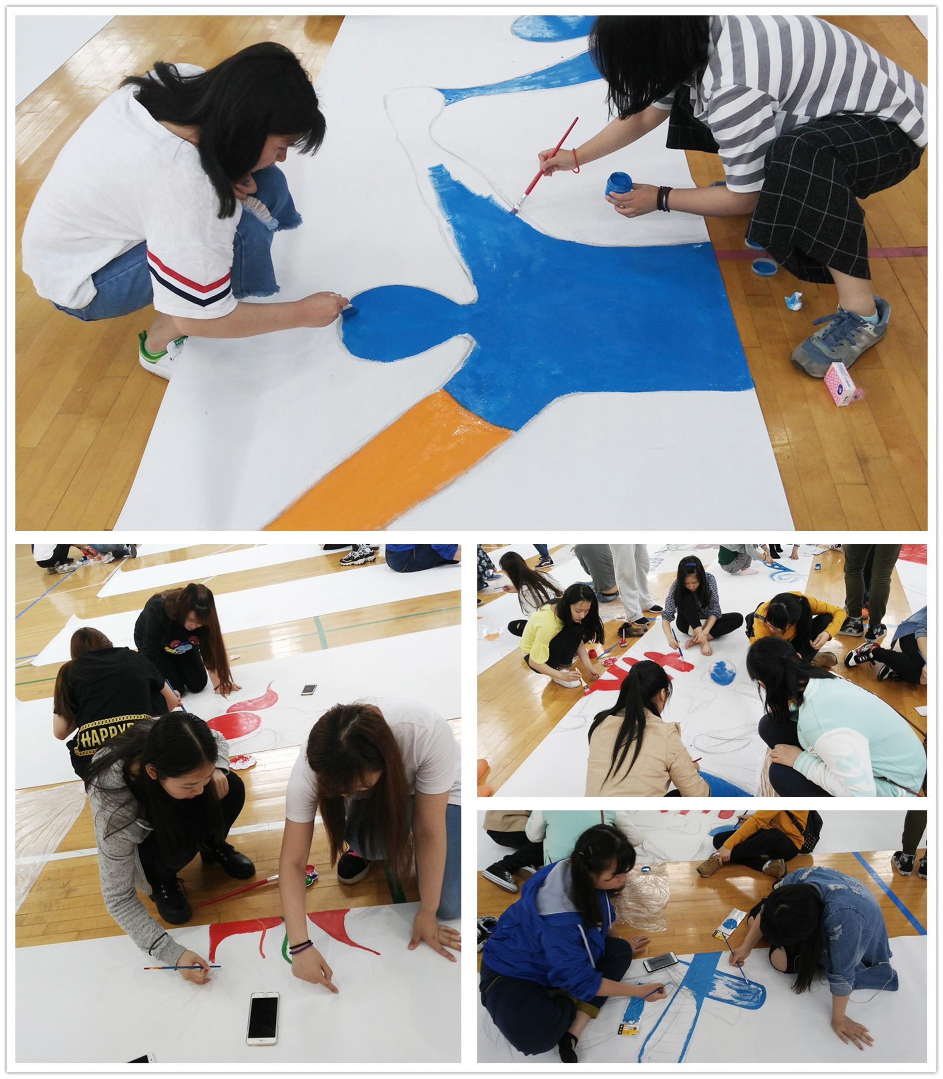 中午12:30在学生处长兼心理健康教育中心主任毛燕静老师开场致辞后,朱新帅老师和两名外援教练带领来自五个二级学院的136名学生参加了本次团队巨画活动。教练将所有团队成员分成了8个大组,每个大组下再分3个职能小组,分别为设计组(负责前期本组作品的设计及最后的拼接)、绘画组(主要负责作品的勾勒及颜色的填充)、后勤组(主要负责原材料的整合及其他的辅助任务)。分组后,8个小组进入了有条不紊的团队创作中。