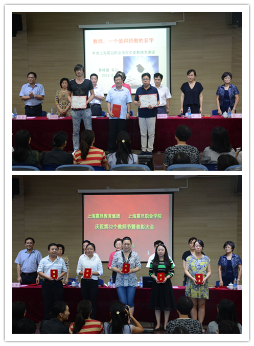 ——震旦教育集团董事长张沈宣读“第二届上海高校青年教师教学竞赛”获奖名单和《关于2015年震旦学院辅导员年度人物表彰决定》,并颁发奖励证书;