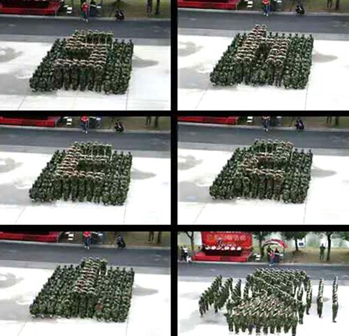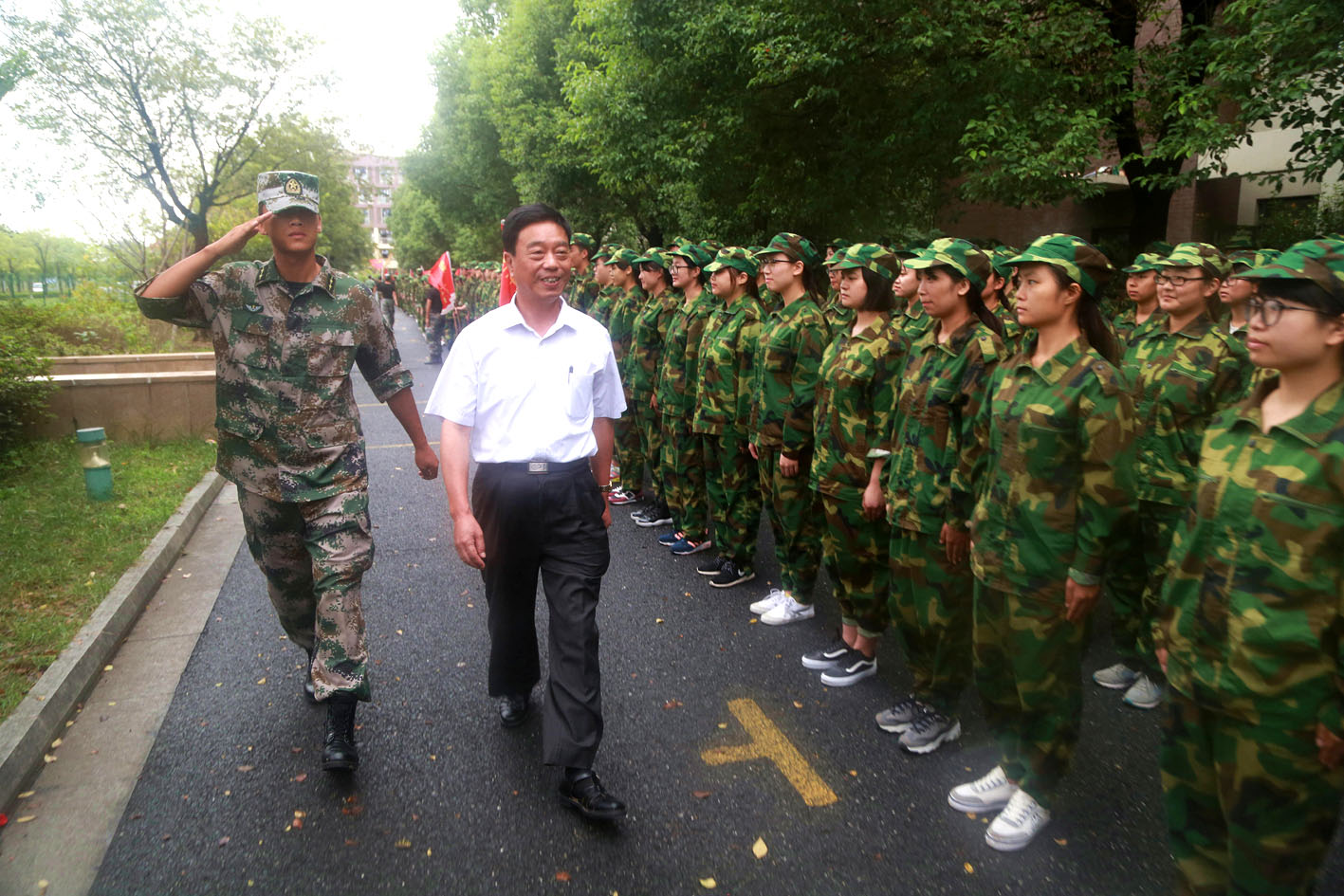 参加军训的全体新生按照军训的编队序列,排列成21个整齐的方队,以迎接学院党政领导的检阅。陈力华院长检阅了各军训方队。