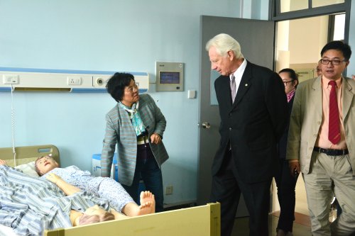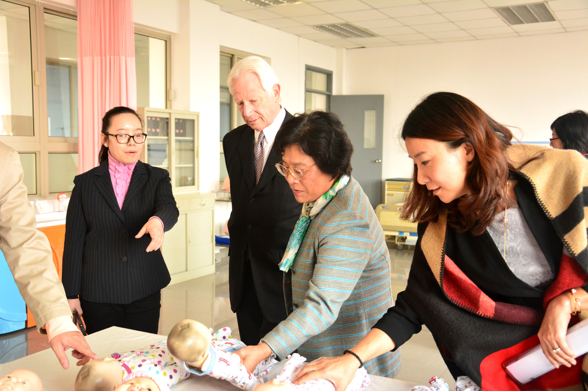 下午,在公共卫生与护理学院专业主任吴景芳老师及实践办主任叶素梅老师的陪同讲解下,Dr.Walker一行饶有兴致地参观了二级学院的各个实训室,并与院长陈力华、调研员曹士勋等相关人员进行了深入沟通与探讨。