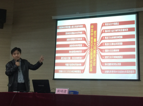 11月10日晚,学院党委书记黄晞建教授为我院高级党校学员做了《面向未来,你准备好了吗?》的主题报告。报告深入浅出的对十八大三、四、五、六中全会的逻辑关系进行了讲解,并结合中共中央关于全面深化改革若干问题的决定和"十三五"规划纲要草案中的民生看点,从生育政策、教育改革、就业创业、城乡统一的建设用地、医疗保障制度、国家产权保障体制改革等方面进行了分析,学员们受益匪浅。