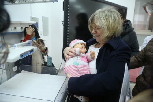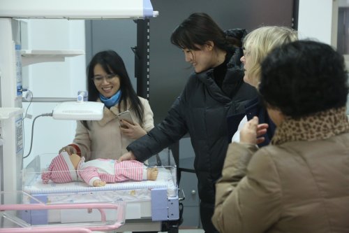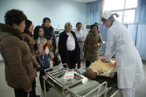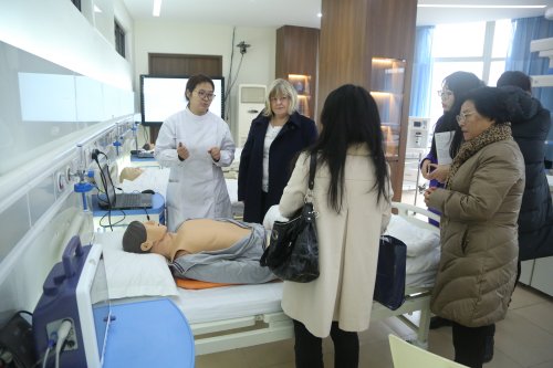 AnnieBarr一行参观了公共卫生与护理学院实训室和医爵教育培训中心,并在模拟人体上亲手实践了心肺复苏等医疗手段,观看了公共卫生与护理学院学生示范的人工呼吸等教学内容。