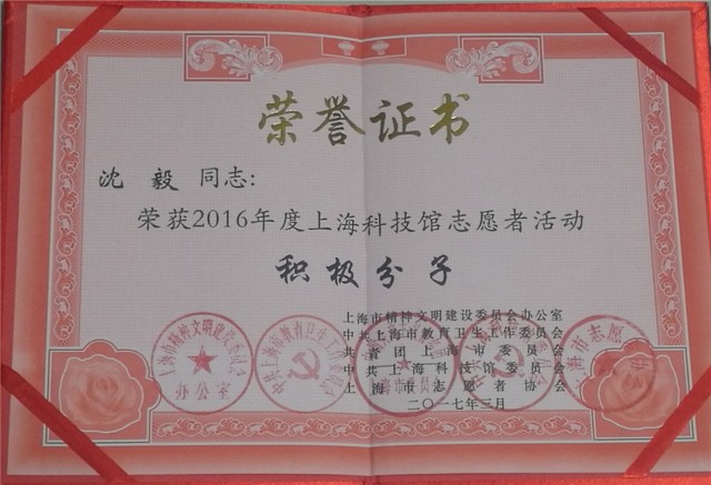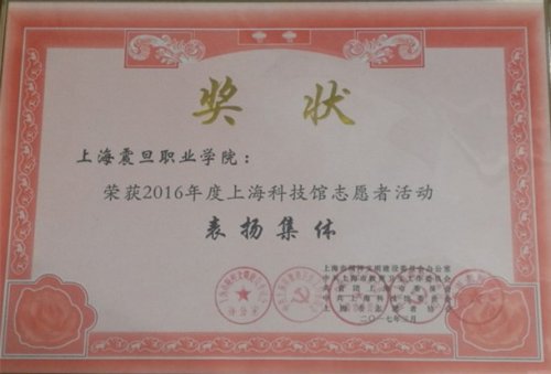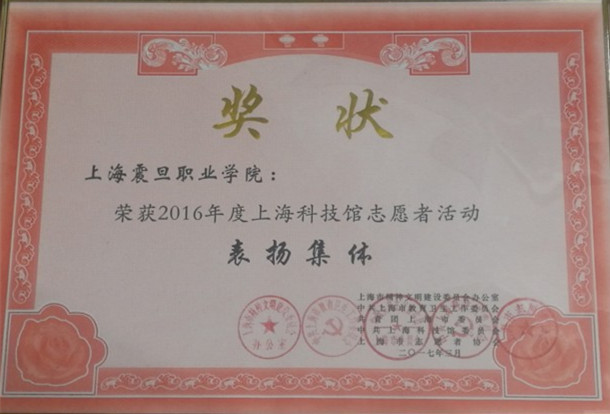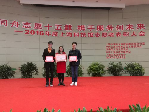 表彰会上,我校被授予“2016年度上海科技馆志愿者活动表扬集体”。我校孙立岩老师被授予“2016年度上海科技馆志愿者活动优秀组织者”称号,社会实践部沈毅同学、刘雷同学被授予“2016年度上海科技馆志愿者活动积极分子”称号。