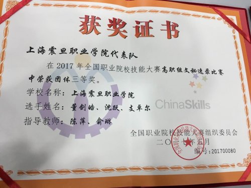 由我校实践办和机电工程学院共同组织,实践办主任叶素梅和陈萍老师带队参加第十届全国职业院校技能大赛文秘速录项目竞赛,荣获该赛项团体三等奖!获奖学生为机电工程学院的董剑皓和沈跃,传媒艺术学院的支卓尔。指导老师陈萍老师获得优秀指导老师奖!这次竞赛竞争非常激烈,有来自28个省市69所高职院校的207名参赛选手参赛,速录高手云集。我校选手发挥很好,经过6个小时的拼搏取得好成绩,是该国赛项目上海市三所参赛院校中唯一获得的奖项。供稿:实践办 叶素梅 审核:胡克文