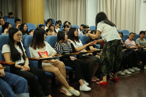 音乐可以激活潜意识,影响情绪。李老师分别播放了悲伤、欢快、恐惧和激昂的音乐片段使同学们感受音乐的感染力。用击鼓传花的方式选出8位同学上台表演“鼓点行走”,同学们随着非洲鼓鼓点行走在台上,时而缓慢,时而欢快。小游戏“下雨咯”使同学们全情投入,小雨(弹舌),中雨(拍腿),大雨(跺脚),同学们跟着老师讲述的故事配合着“下雨”。“波浪传递游戏”将整个讲座的气氛推向高潮。李老师强调肢体接触可以有利于快速建立关系。随着“音乐回声游戏”、“再见歌曲”整个讲座接近尾声。