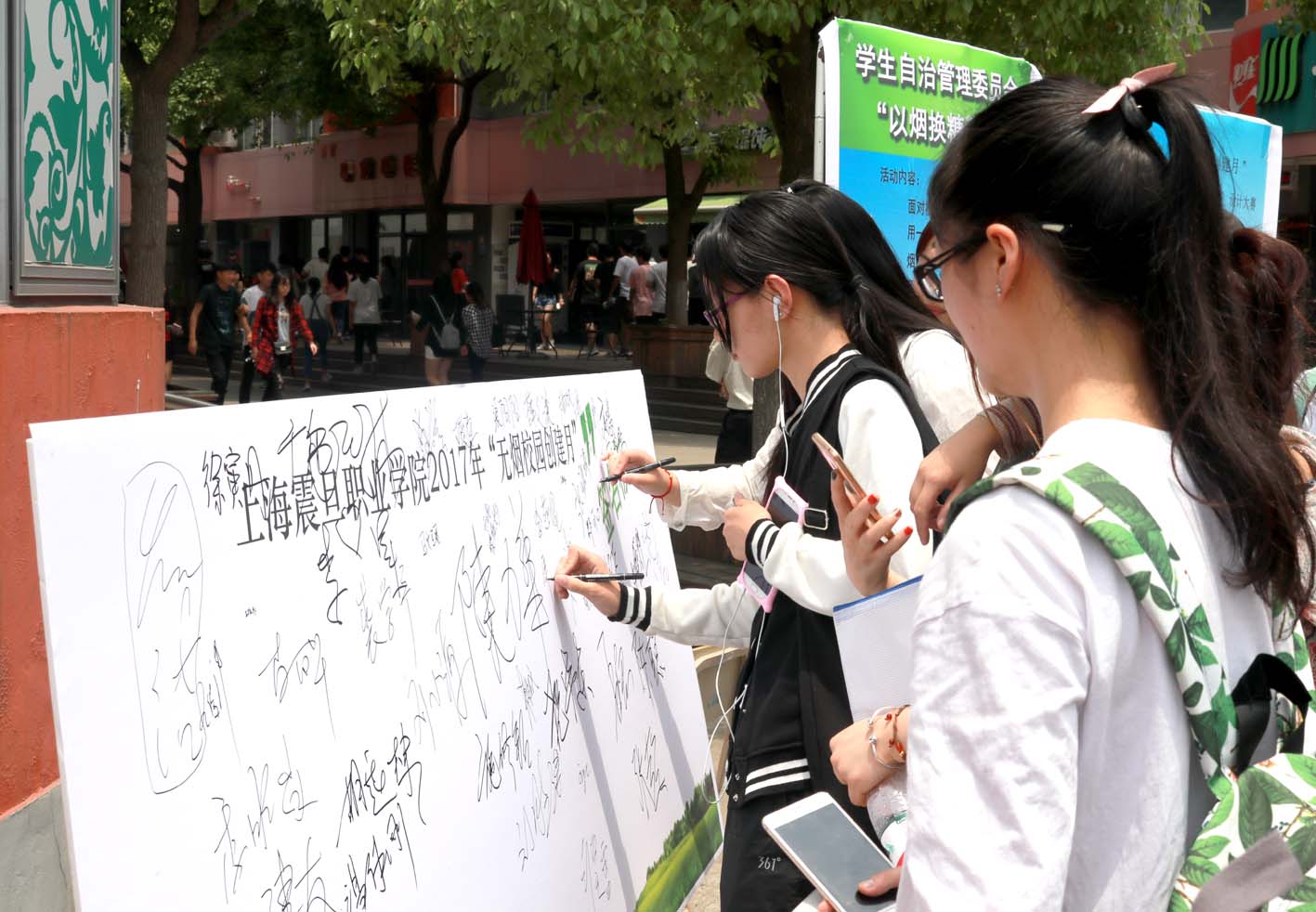 为贯彻落实《上海市公共场所控制吸烟条例》,加强学风建设,改善校园环境,树立和展现我校师生良好的精神面貌,养成良好文明的生活习惯,创造文明、洁净、优美的校园环境。学工部联合文明办,于2017年4月25日至5月31日开展了以“无烟校园创建月”为主题的系列活动。