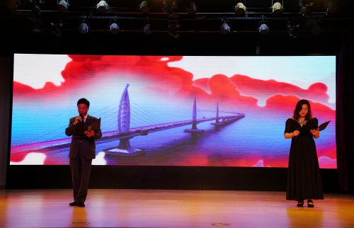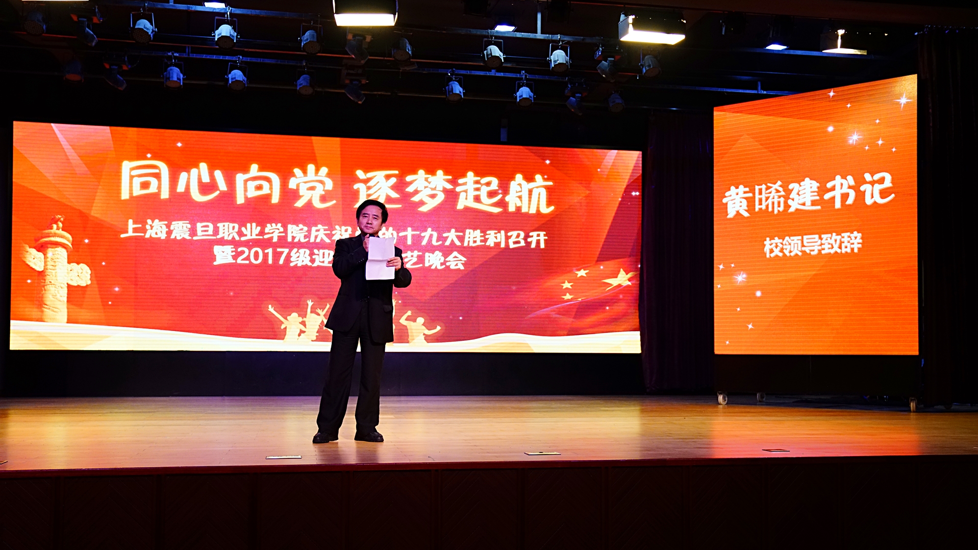 党委书记黄晞建教授上台致辞,书记即兴创作了一首《震旦喜迎十九大》,充满激情地朗诵,表达了震旦全体师生庆祝党的十九大胜利召开的共同心声!
