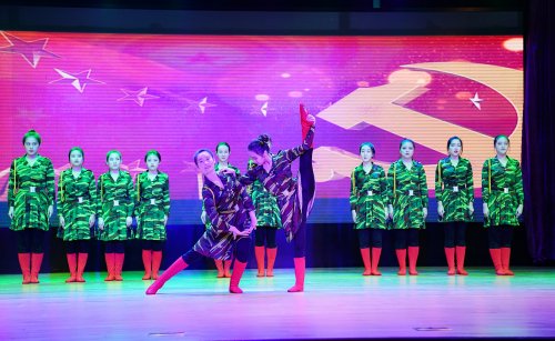 音乐舞蹈中心带来的舞蹈《红色赞歌》拉开了晚会的序幕。表演者们身穿迷彩服,迎着变换的灯光,那抹好似圣洁之光的绿色照进每一位震旦人的心,旋转、跳跃,昂首挺胸的身姿踏着音乐的旋律,曼妙的肢体谱写生命的律动之美,和谐之韵,舞出了对中国共产党的深深敬意。