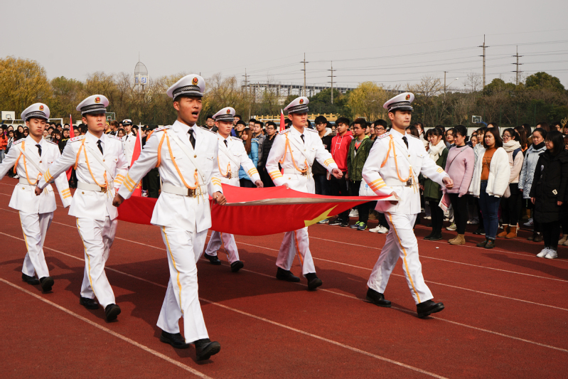 在徐磊老师宣布本届军训营结营式开始后,毛燕静老师宣读了关于我校国旗班成立的决定。校长陈力华庄重地向国旗班授旗,国旗班班长梁喻豪接过国旗,并进行了庄严地宣誓:“护卫国旗,重于生命”。紧接着,英姿飒爽的国旗班成员们护卫五星红旗,踏着坚定的步伐走向升旗台,全场肃静,升国旗,奏国歌。