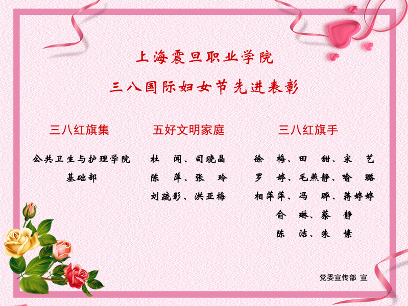 大会首先由王纯玉副校长宣读《上海震旦教育集团2017年度“三八”红旗集体、“三八”红旗手、“五好”文明家庭获奖名单》,与会领导为受表彰的先进女教职工颁发荣誉证书。学校基础部袁琨老师和机电工程学院陈萍老师分别代表三八红旗集体和五好文明家庭上台发言。
