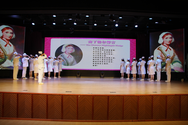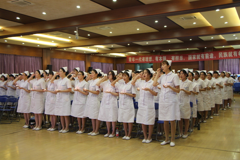 随后所有护理专业的同学们,手捧蜡烛,在曹婷老师带领下,在南丁格尔的画相面前庄严宣誓:“余谨以至诚,于上帝及会众面前宣誓:终身纯洁,忠贞职守,尽力提高护理之标准;勿为有损之事,勿取服或故用有害之药;慎守病人家务及秘密,竭诚协助医生之诊治,务谋病者之福利。”