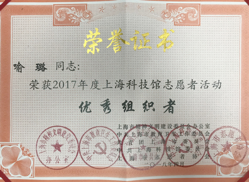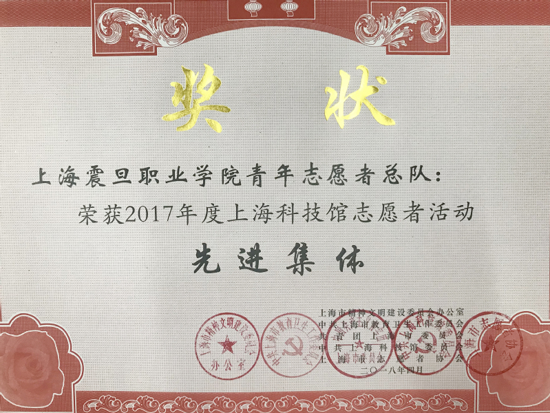 近日,“逐梦新时代 志愿新征程——2017年度上海科技馆志愿者表彰大会”在科技馆四楼会议大厅举行,市文明办领导、科技馆领导、团市委领导、高校领导、市民志愿者及高校志愿者代表400余人出席了本次大会。表彰会上,我校青年志愿者总队被授予“2017年度上海科技馆志愿者活动先进集体”。我校喻璐老师被授予“2017年度上海科技馆志愿者活动优秀组织者”称号,社会实践部李昊岳、夏鑫、王振宇同学被授予“2017年度上海科技馆志愿者活动积极分子”称号。