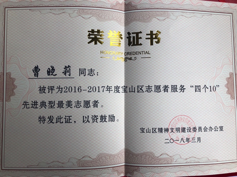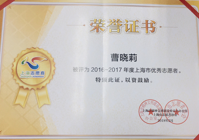 我校志愿者集体、个人多次获得市区级表彰。校团委书记曹晓莉老师荣获“2016--2017年度上海市优秀志愿者称号”、2016--2017年度宝山区志愿者服务“四个10”先进典型最美志愿者,并作为宝山区优秀青年代表五四期间受到区领导接见。