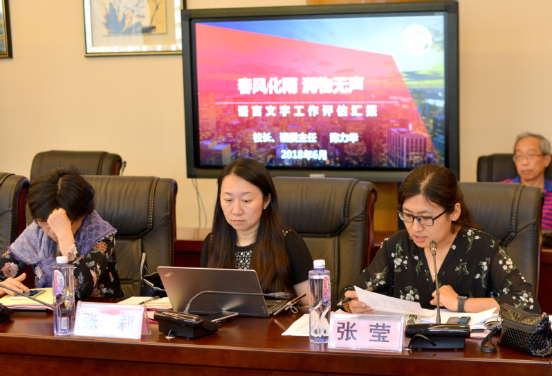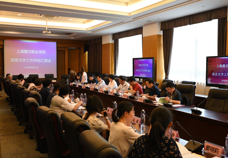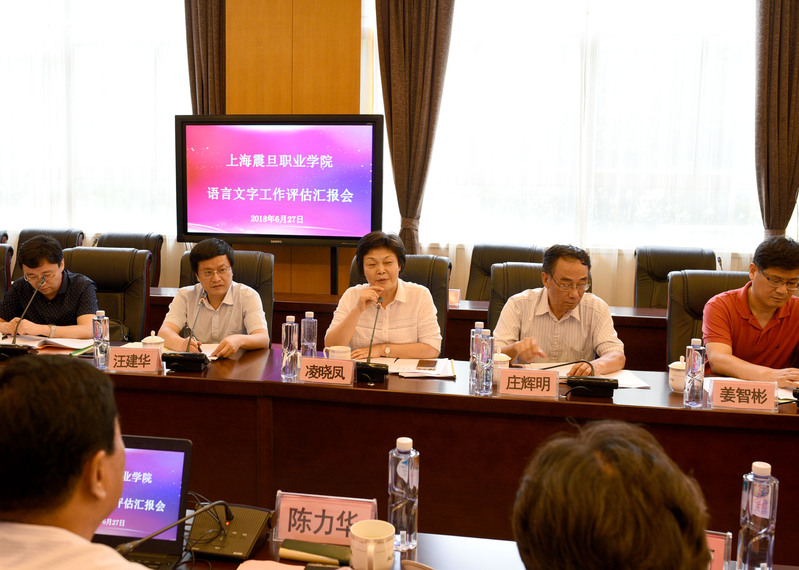 评估汇报会由上海市教育评估院综合所所长汪建华主持,参加汇报会的有市教委语管处处长凌晓凤,全体专家组成员,理事长张惠莉、校长兼语委主任陈力华、党委书记黄晞建、党委副书记夏臻,副校长王纯玉以及全体语委委员。