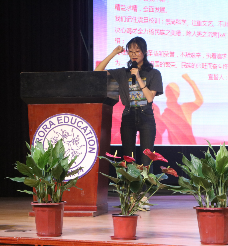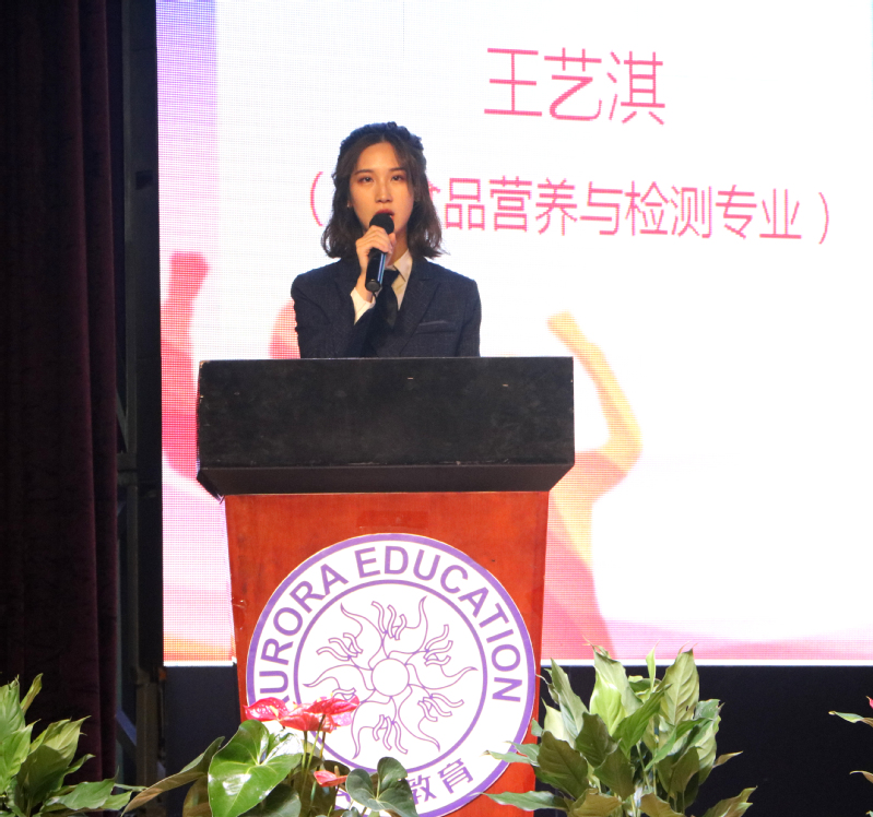 国家奖学金获得者、中共预备党员、校团委副书记、校学生会主席,2016级食品营养与检测班的王艺淇同学代表全体学长发言。她话语朴实,情感真挚,向同学们娓娓道来自己在震旦的成长经历,并用自己的经历向新生阐述如何“确定目标、坚持学习、培养能力、珍惜时间”四者并行规划和充实自己的大学三年生活。