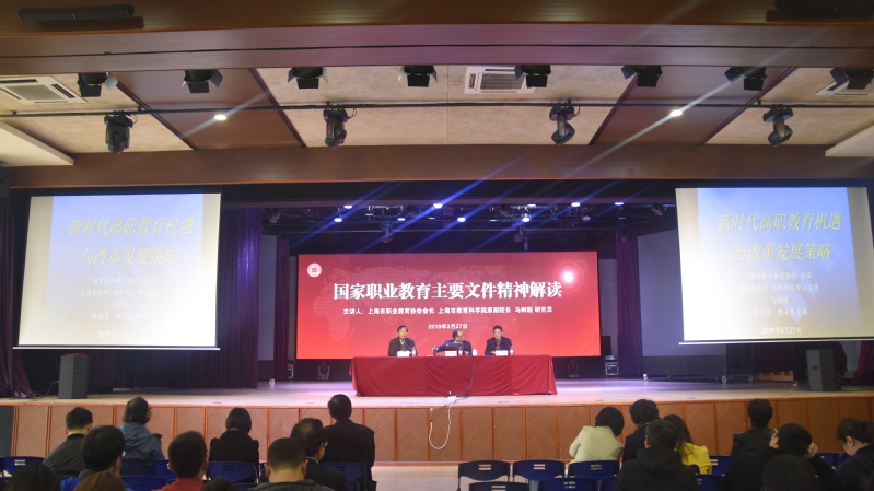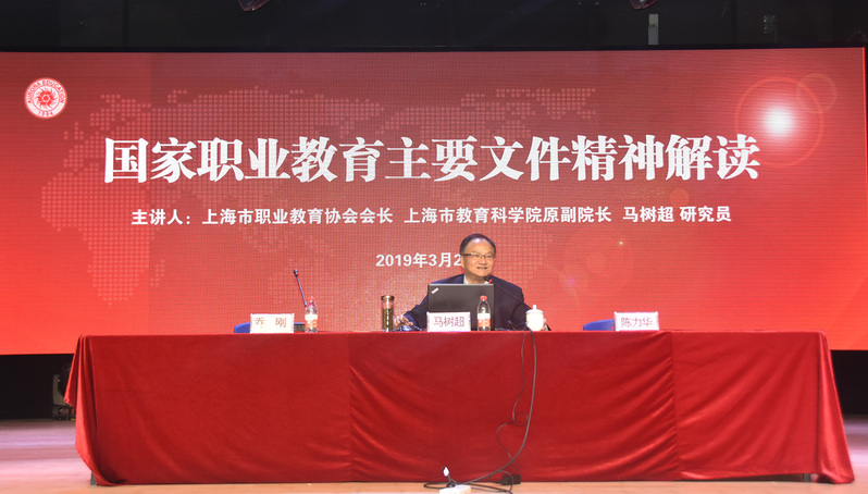 2019327日下午,学校全体教职工在大礼堂进行了2019年第一次全员培训,邀请了上海市职业教育协会会长、上海教科院高职研究中心主任马树超教授做题为“新时代高职教育机遇与改革发展策略”的专题报告。