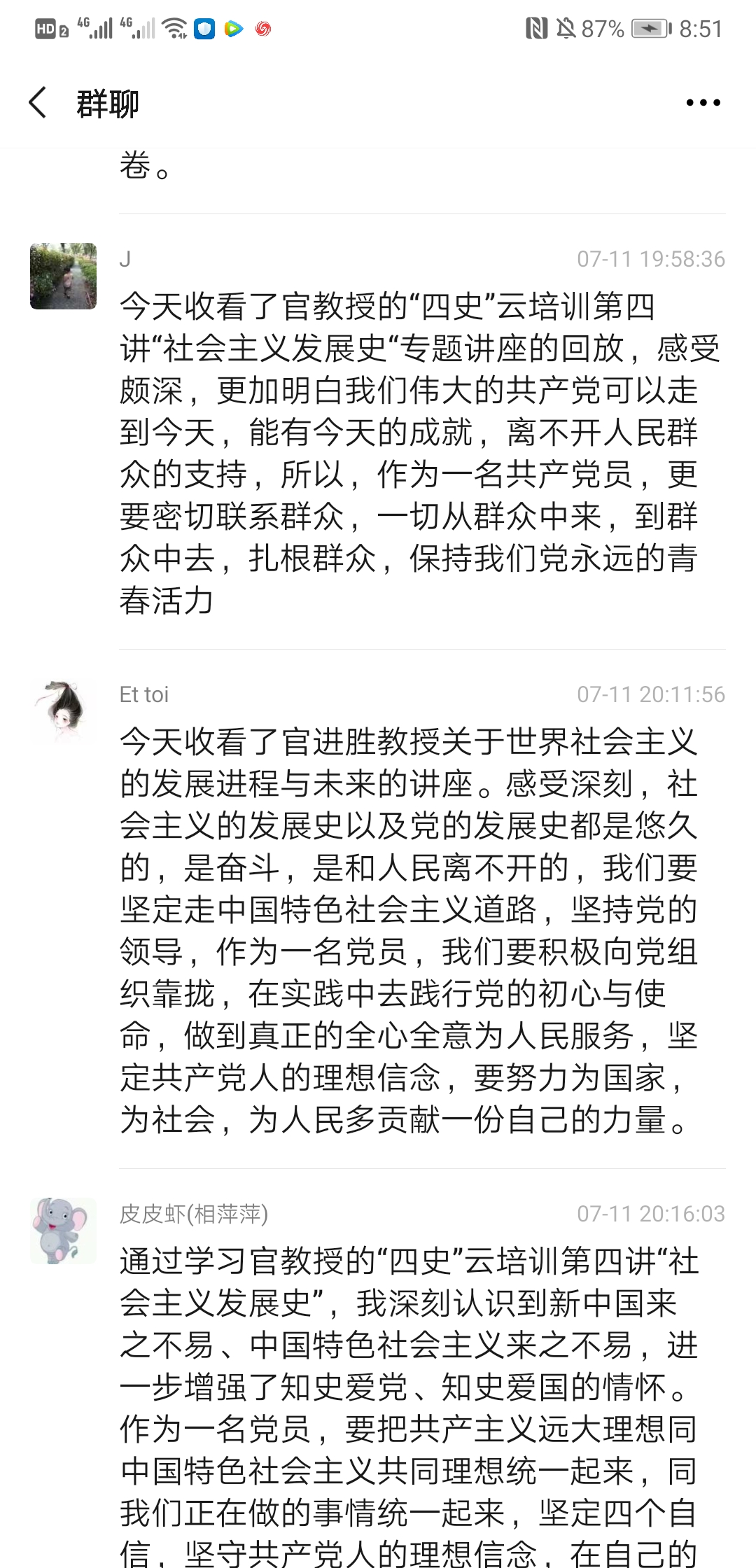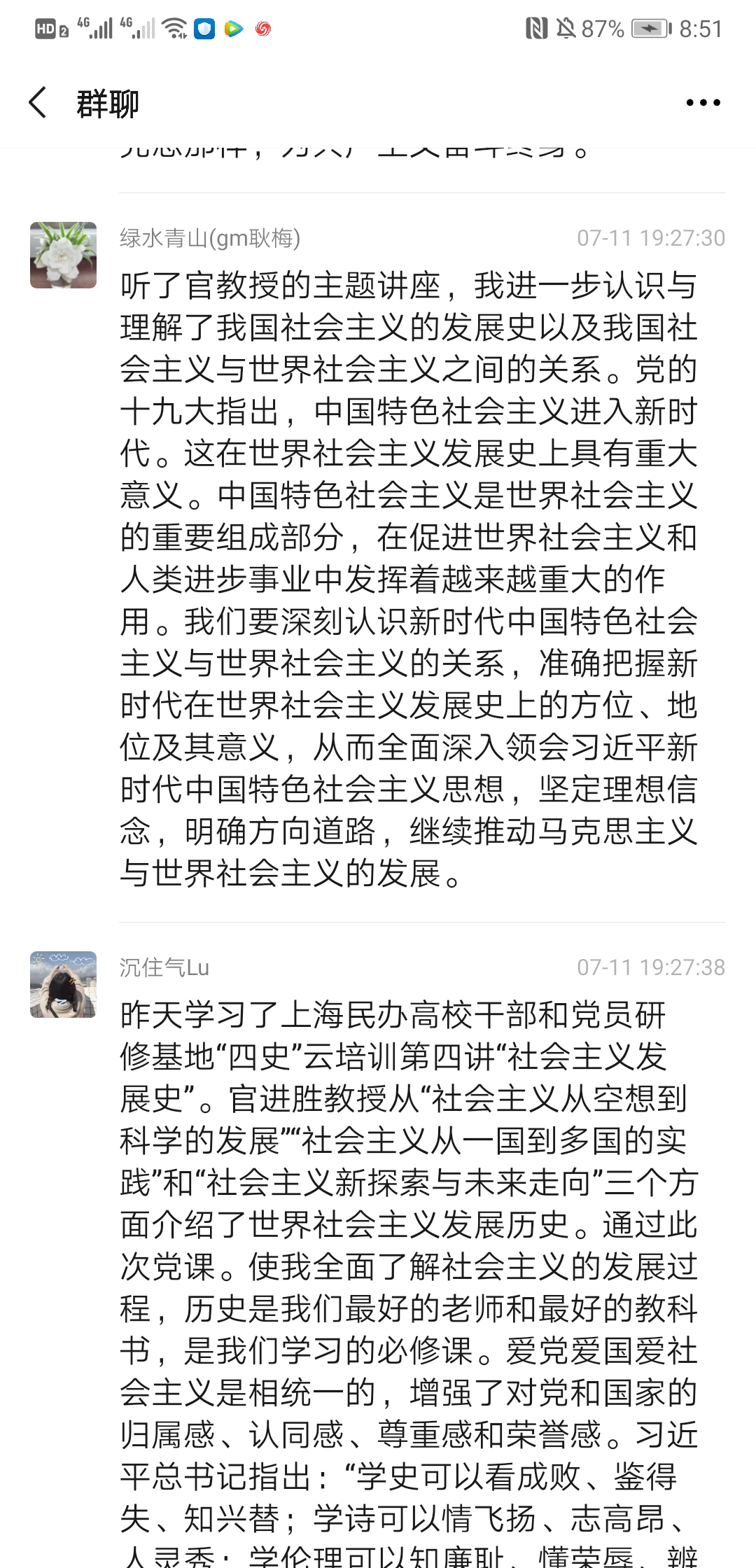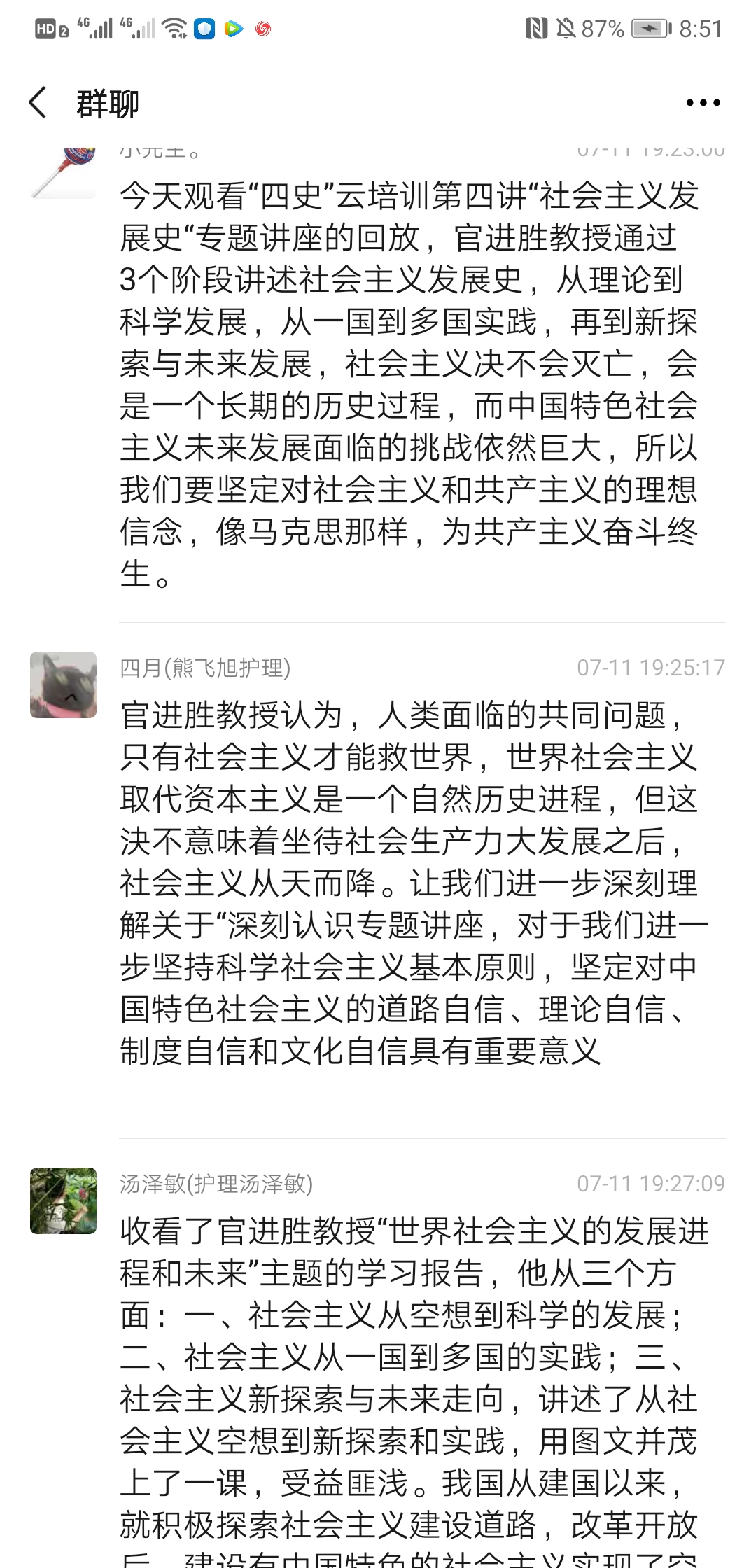 2020710日上午930上海民办高校干部和党员研修基地“四史”云培训第四讲“世界社会主义的发展进程与未来”专题讲座准时开讲,主讲人是上海市委党校科学社会主义教研部主任官进胜教授。为加强师生党员同志对社会主义发展史的认识和理解,公共卫生与护理学院党总支组织所有师生党员收看了官教授的讲座,并于1119:00-20:00开展了一次线上研讨会,共同探讨本次讲座的学习心得与体会,师生党员同志们系统地回顾了世界社会主义的发展历程,进一步加深了对社会发展规律的认识,增强了对中国走社会主义道路的决心和信心,对世界社会主义的美好前景充满期待。以下是部分同志发言记录: