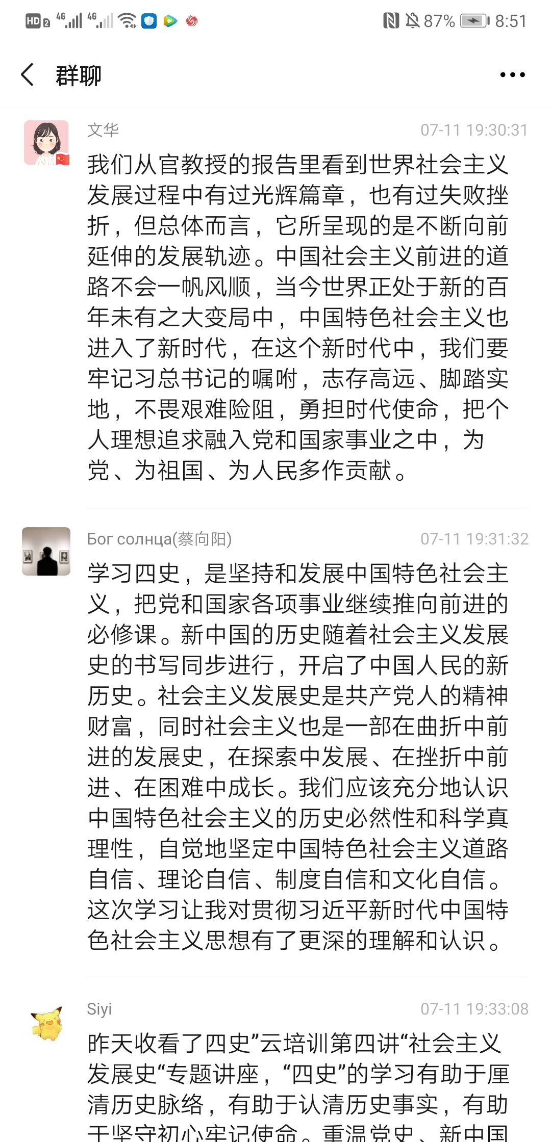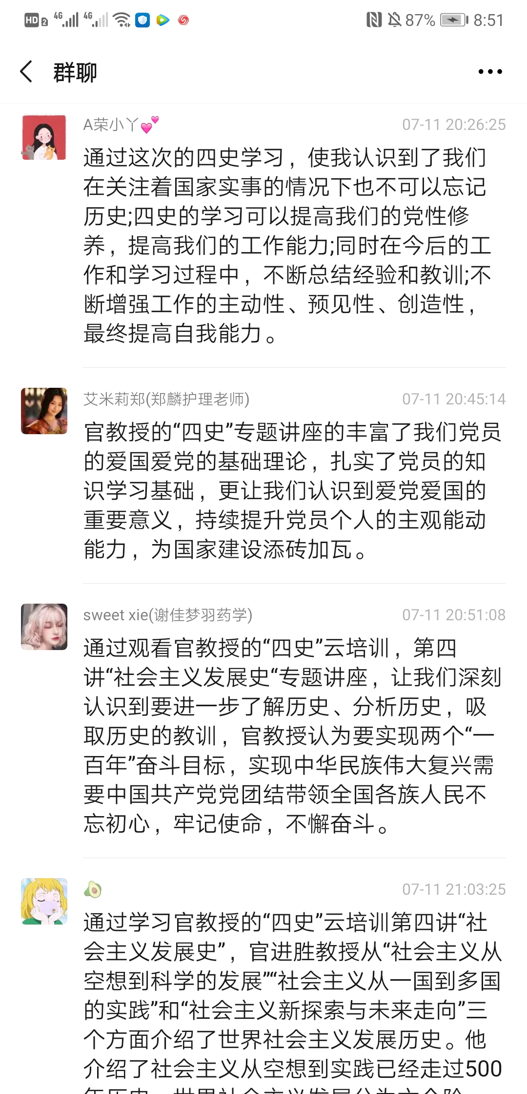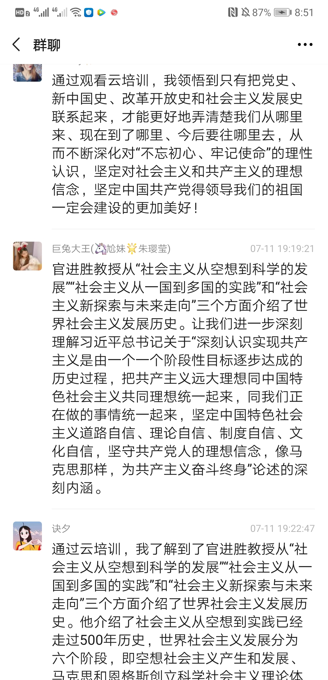 2020710日上午930上海民办高校干部和党员研修基地“四史”云培训第四讲“世界社会主义的发展进程与未来”专题讲座准时开讲,主讲人是上海市委党校科学社会主义教研部主任官进胜教授。为加强师生党员同志对社会主义发展史的认识和理解,公共卫生与护理学院党总支组织所有师生党员收看了官教授的讲座,并于1119:00-20:00开展了一次线上研讨会,共同探讨本次讲座的学习心得与体会,师生党员同志们系统地回顾了世界社会主义的发展历程,进一步加深了对社会发展规律的认识,增强了对中国走社会主义道路的决心和信心,对世界社会主义的美好前景充满期待。以下是部分同志发言记录: