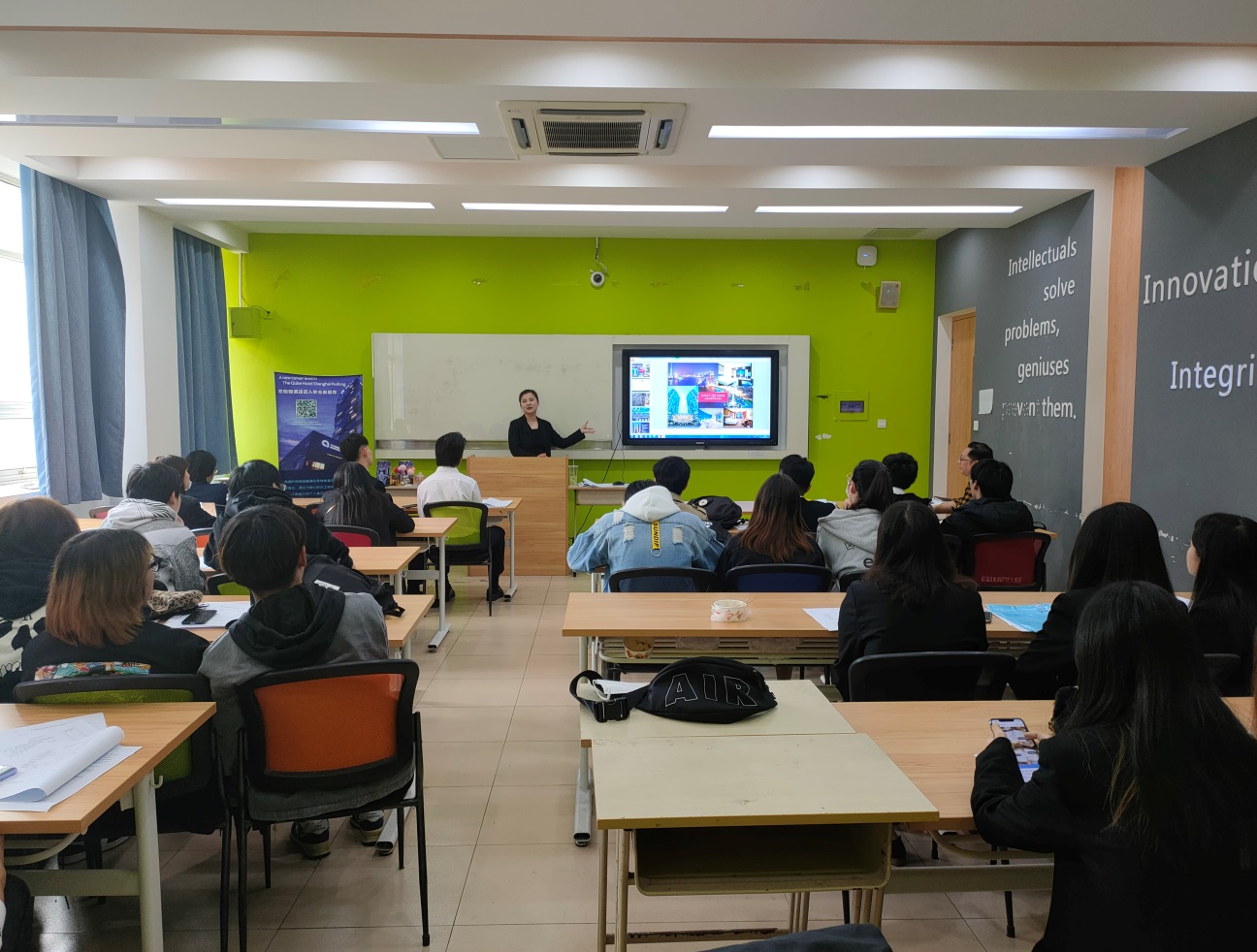 宣讲会现场气氛热烈,浦东绿地铂骊从酒店营收发展的角度介绍了酒店的概况、理念人才策略以及实习培训生的岗位,同时对于应聘者的具体要求和发展通道进行了简单的介绍,并结合自身经历跟学生们分享了工作的经验和心得。