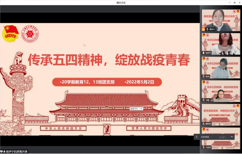 5月4日下午,20护理1、2、3班召开了以“传承五四精神,凝聚青春力量”为主题的线上班会活动,辅导员赵梦雪通过照片向同学们展示了校园封控期间和上海疫情防控阶段一批优秀青年学子冲锋在前,奔赴在核酸检测、搬运物资、防疫宣传等抗疫一线的事迹,生动诠释了新时代青年学生的责任与担当。最后志愿者分享了他们在志愿服务过程中的故事。