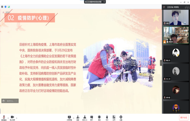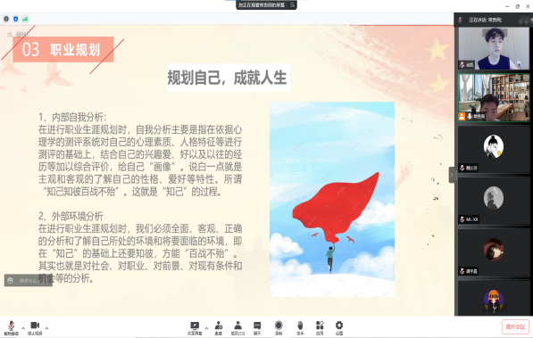 团支书常贵周和心理委员李昊川先后发言,对心理健康与亚健康给人造成的影响进行阐述,并希望同学们都能够有一个持续且积极发展的心理状态,充分发挥身心潜能,尤其在疫情期间,心理活动的频率、幅度可能会增加,倡导大家通过健康饮食、保障睡眠等方式对自身心理压力进行缓解。另外,大学时光已经过半,职业规划显得越来越重要,它就是我们人生路上的灯塔、航标,照亮和指引前进的方向,希望同学们沉下心对自己的职业生涯乃至人生进行系统的计划。