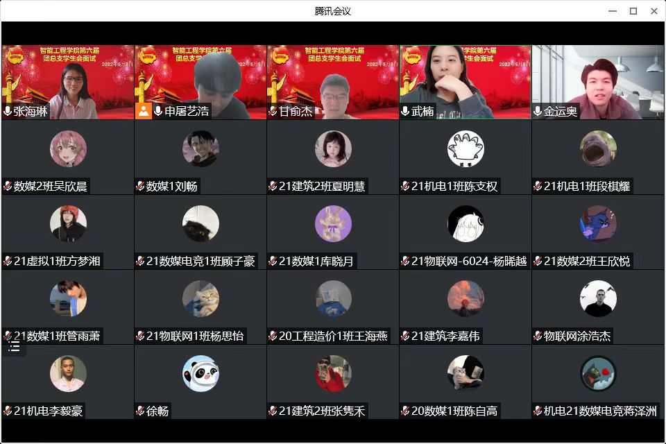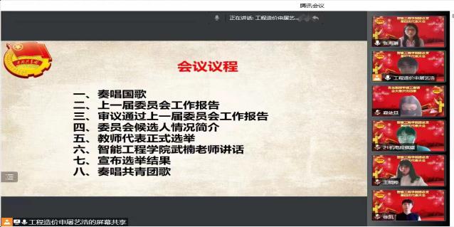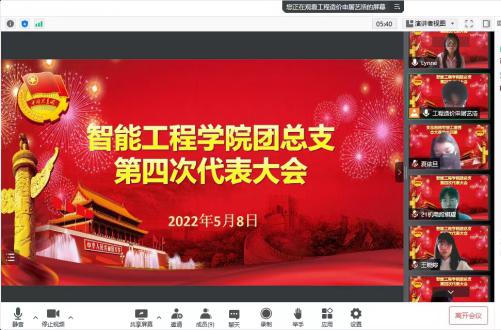 2022年5月8日下午2点,智能工程学院团总支线上召开了智能工程学院第四次代表大会暨第七届团总支学生会竞选大会。智能工程学院学院党总支副书记武楠老师、团总支书记张海琳老师出席了大会,团总支委员甘俞杰、团总支副书记申屠艺浩、学院辅导员夏依旦老师,以及团总支常任委员参加了会议。会议由团总支副书记申屠艺浩主持。