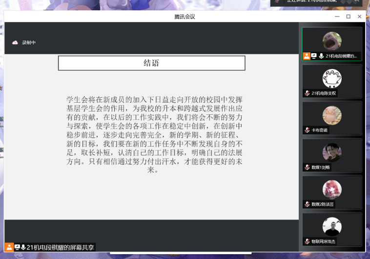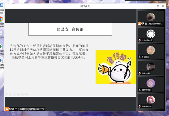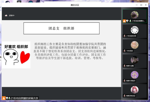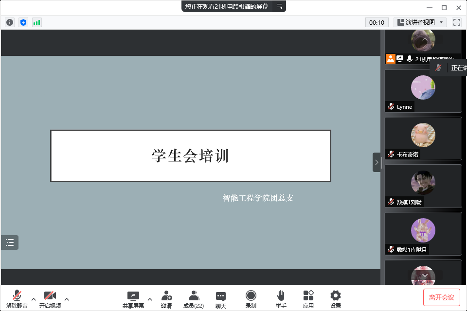 根据校学生会春季学期培训部署安排,为做好换届后的团总支学生会成员的培训工作,帮助新成员进一步了解团总支学生会各部门的工作职责和内容,2022年5月16日晚18点30分,智能工程学院2022年春季学期学生会组织培训会(第一场)在腾讯会议召开。