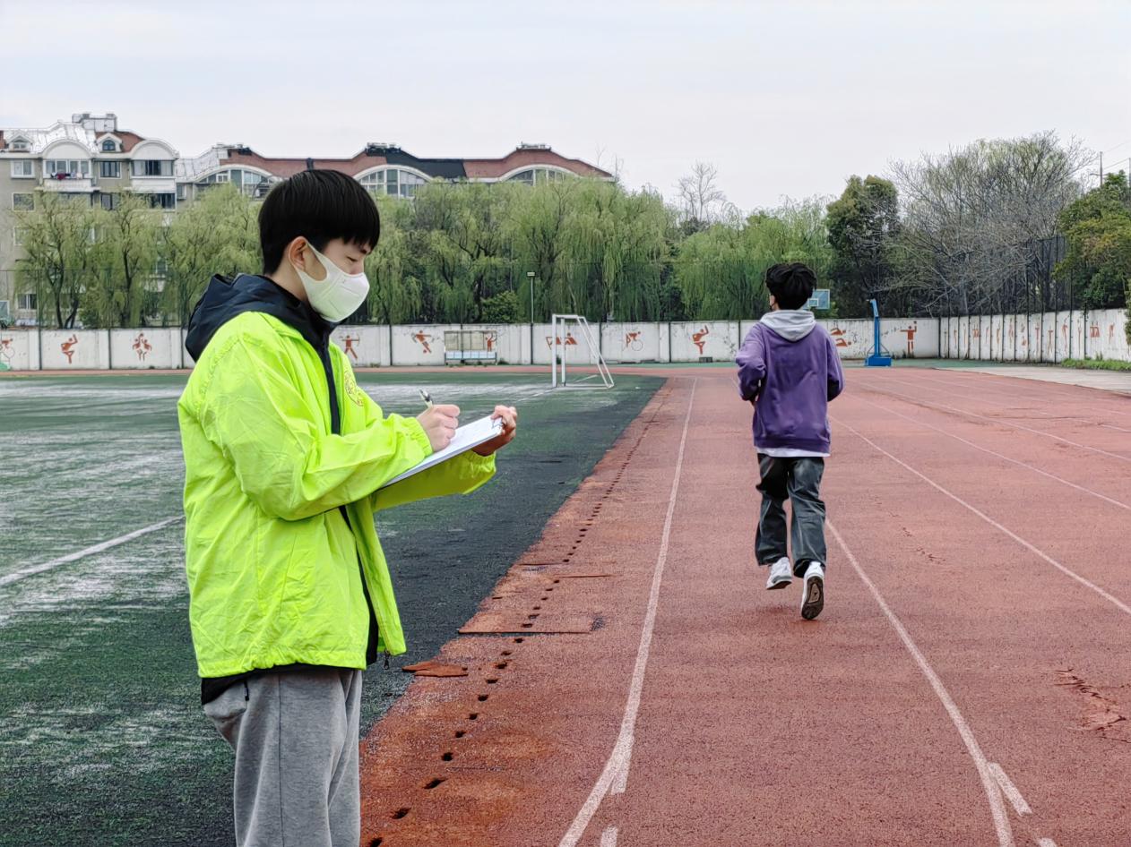 李炎在操场为自主招生体育校测的同学做好成绩记录