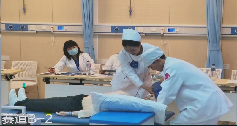 本届比赛内容包括理论试题,心肺复苏,心电监测及静脉留置针输液四个项目。我校2021级护理专业的参赛选手黄穗穗,吴樟韩,王丙威和方哲在黄欢、曹婷两位老师的指导下,以“道阻且长,行则必至”的毅力和力争上游的志气,认真备赛。无论是训练场地,还是训练器材,学校都给予了无条件支持。同时老师与辅导员为保证参赛选手后方阵地,及时调整课时,使参赛选手全身心投入比赛,为校争光。