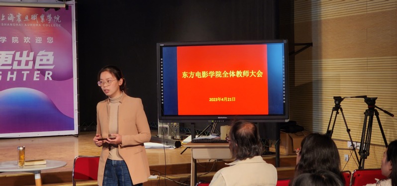 2023年4月21日下午,东方电影学院在2号教学楼新闻演播厅召开了全体教师大会,安排部署近期工作。院长郜明教授主持会议,各专业主任、实训室主任、教学秘书、辅导员、专兼职教师、实训员参加了会议。