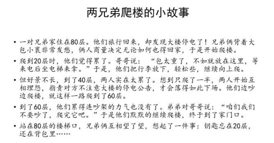 1.当代大学生求职就业环境。以”两兄弟爬楼的小故事”引发学生自由讨论,从蕴含的道理引入到当下求职就业环境主题.2023届应届毕业生的人数在增加,因疫情、地区冲突、外部环境多变等原因,毕业生就业形势异常严峻,不容乐观。面对严峻的就业环境,自我正确认识和定位尤为重要,抛出几个小问题,引导学生思考,进行自我认识.