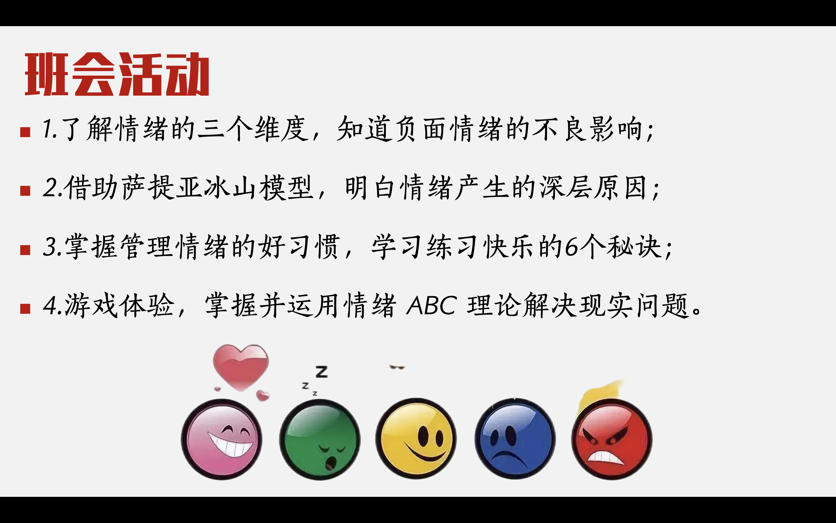 三.活动过程。认识“情绪”真面目:什么是“情绪”、解读情绪的三个维度、负面情绪的不良影响;了解情绪的深层原因:播放视频《萨提尔的内在冰山》、真实故事的练习、深层次探索、启示;管理情绪,练习快乐:交流讨论‘网上有这样一句话:“不要因为5分钟的不开心,就耽误你23小时55分钟的开心’。游戏体验;情景还原、播放视频《情绪ABC理论》、故事新编、欣赏歌曲《海阔天空》