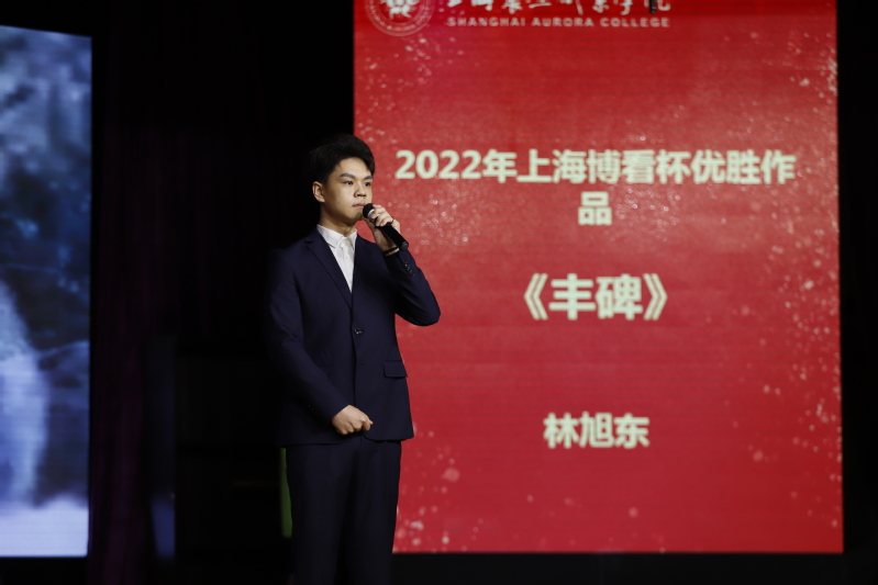 21戏剧影视表演1班林旭东带来诗朗诵《丰碑》,该作品已进入2022年上海市博看杯诵读大赛决赛。尽管时光无情地飞逝,但我们都会牢记那些抛头颅、洒热血的日子,我们更会铭记那个扣人心弦、轰轰烈烈的年代。