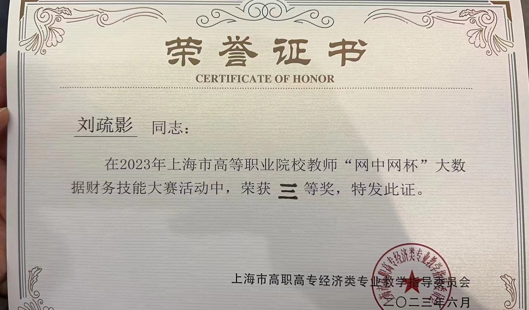 4 | 教师参加2023年上海市高等职业院校教师“网中网杯”大数据财务技能大赛获三等奖 | 刘疏影 |