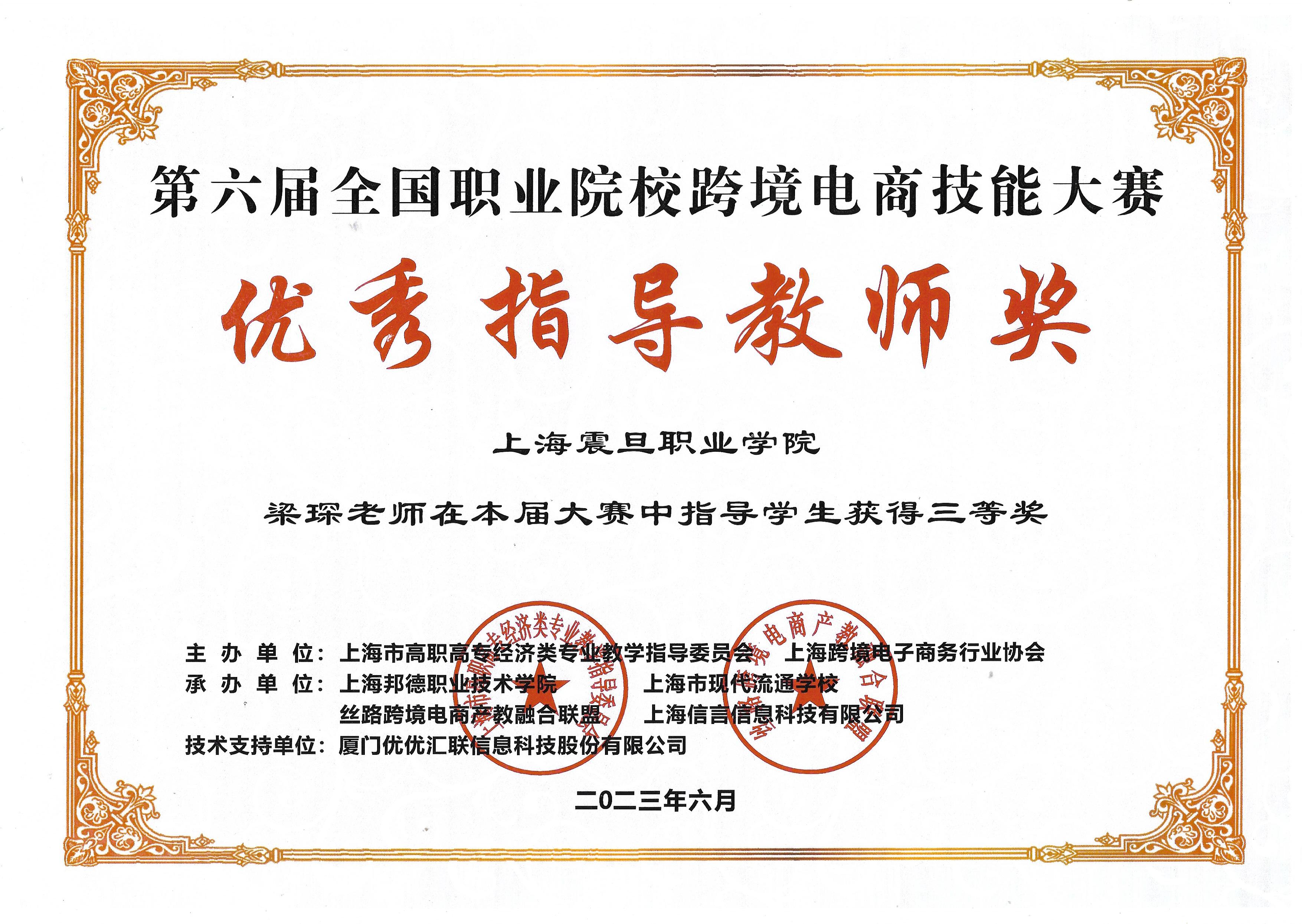 2 | 指导学生参加第六届全国职业院校跨境电商技能大赛获三等奖,教师获优秀指导教师奖 | 梁琛 |