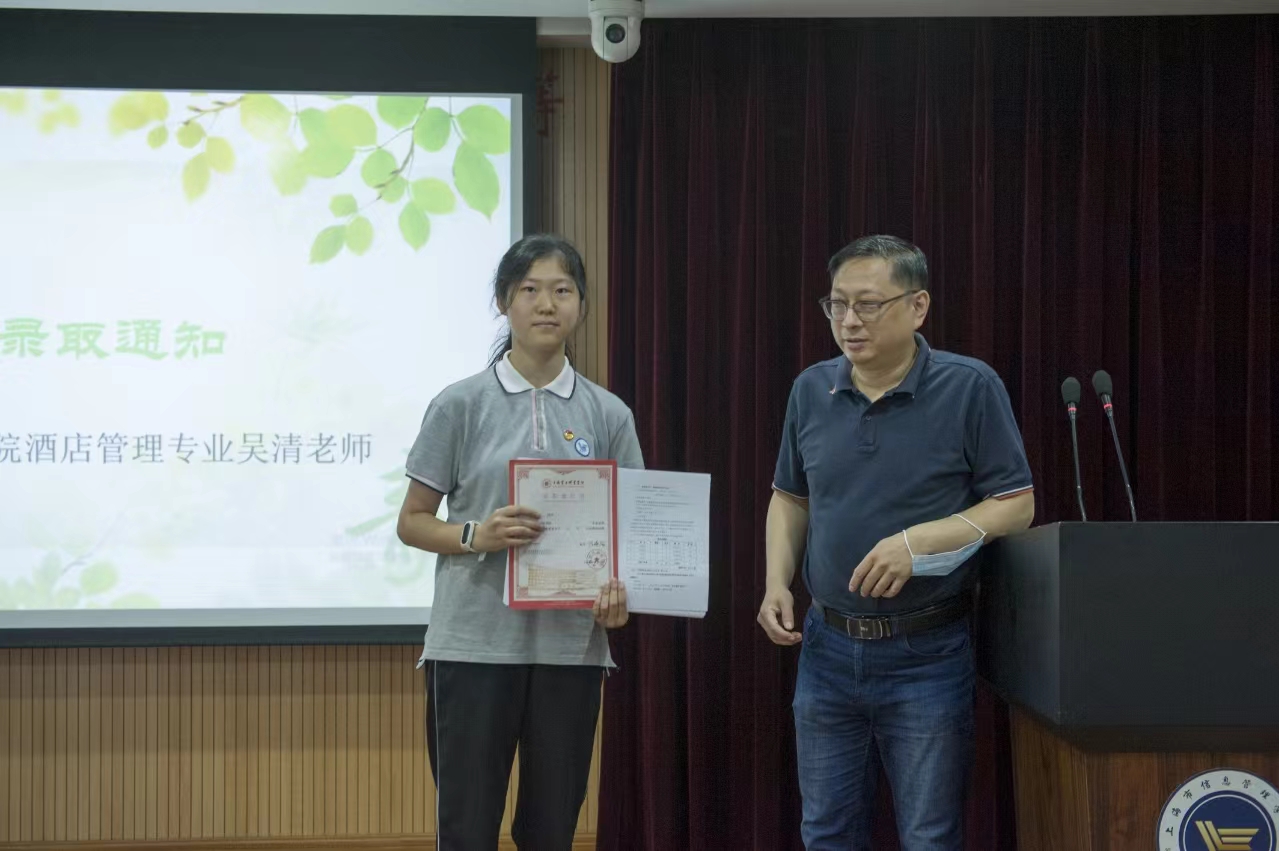 吴清老师向学生代表陈心怡颁发了录取通知书。