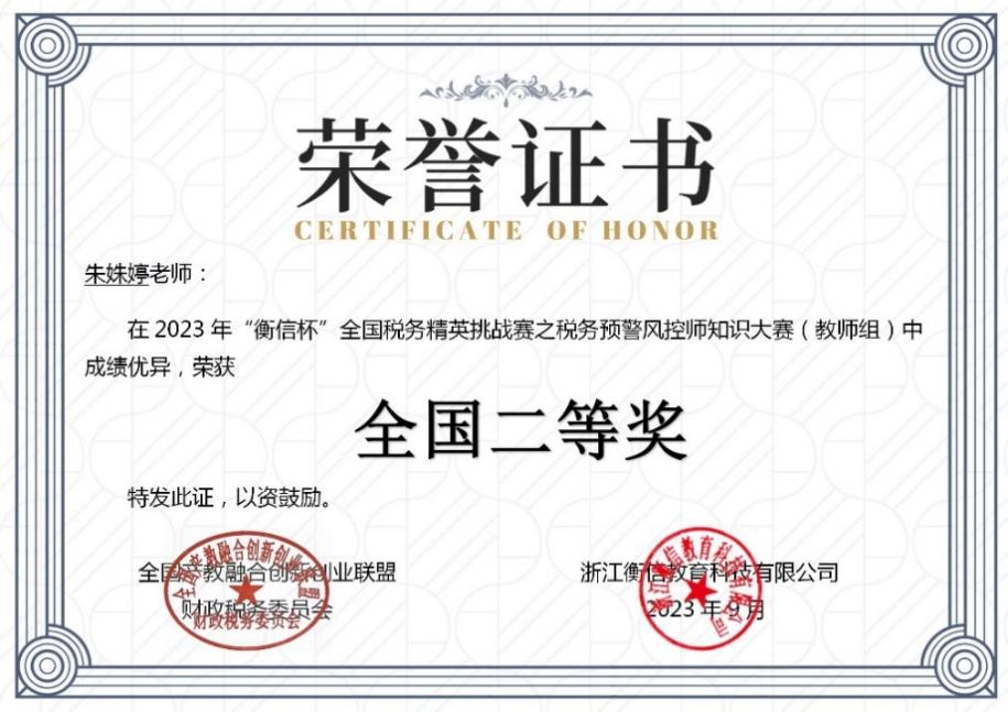 由全国产教融合创新创业联盟财政税务委员会和浙江衡信教育科技有限公司联合主办的“衡信杯”全国税务精英挑战赛于8月29日结束,我校经济管理学院朱姝婷老师喜获全国二等奖。全国有近400所中高职、本科院校教师参加了此次比赛,我校朱姝婷老师在比赛期间不断强化税收风险知识、税法知识、纳税筹划、税收征管和涉税服务等方面的知识,圆满完成比赛。大赛围绕推动税法宣传教育、拓展税收共治格局、推动税法知识进校园、促进税务师行业与高校产教融合等主题,为教师“赛教融合”的探索提供了实践经验,为教师教学改革提供了借鉴。