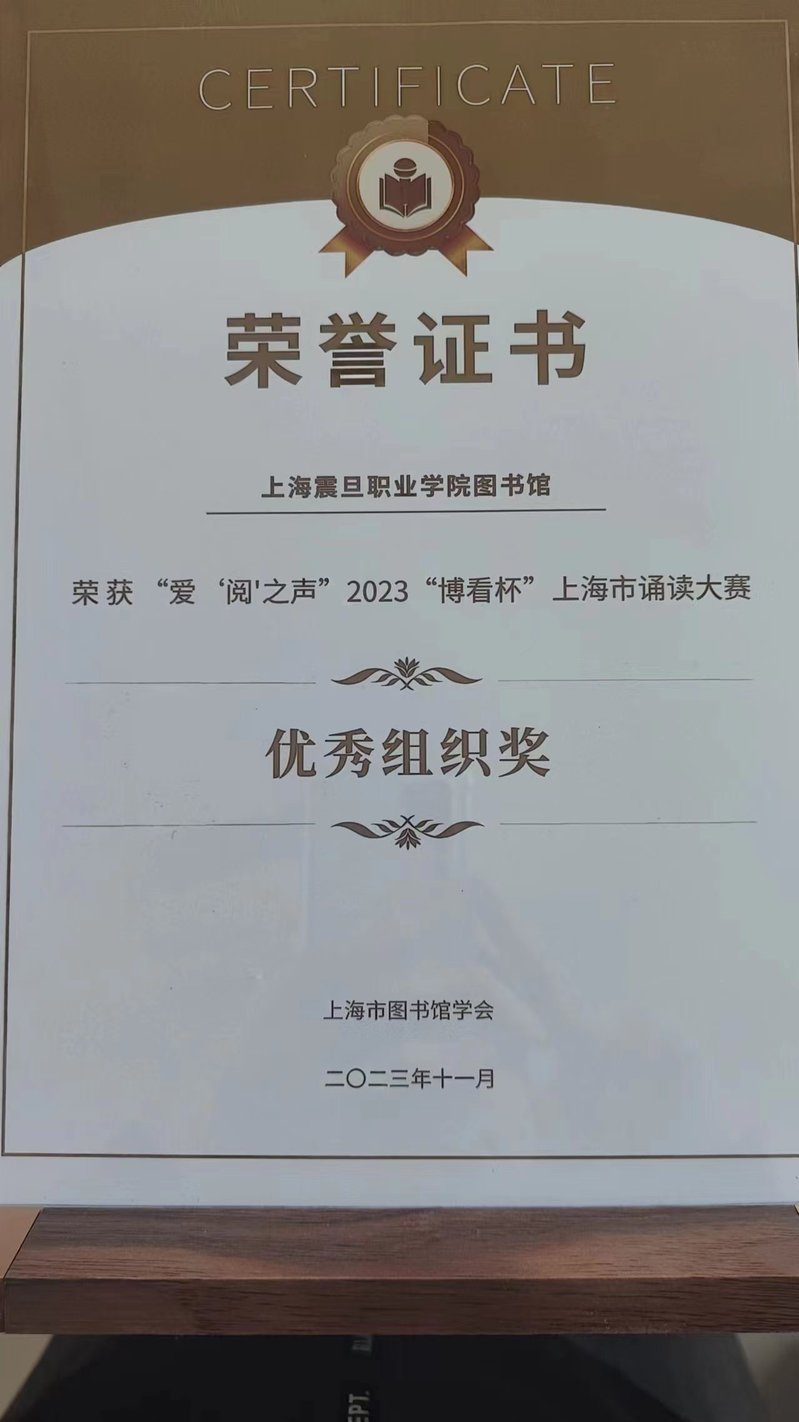 为进一步推进上海市文化建设,鼓励广大市民读者和在校大学生多读书、读好书、勤思考,从读书中汲取力量与智慧,提高自身文化素质,形成人人读好书、人人好读书的终身学习目标,由上海市图书馆学会阅读推广委员会主办,上海市图书馆学会新媒体阅读推广委员会、博看网共同承办,上海市各参赛高校图书馆及公共图书馆共同参办的“爱‘阅’之声”2023“博看杯”上海市诵读大赛落下帷幕。我校图书馆荣获优秀组织奖,图书馆刘圣德老师获得“优秀领队”称号。