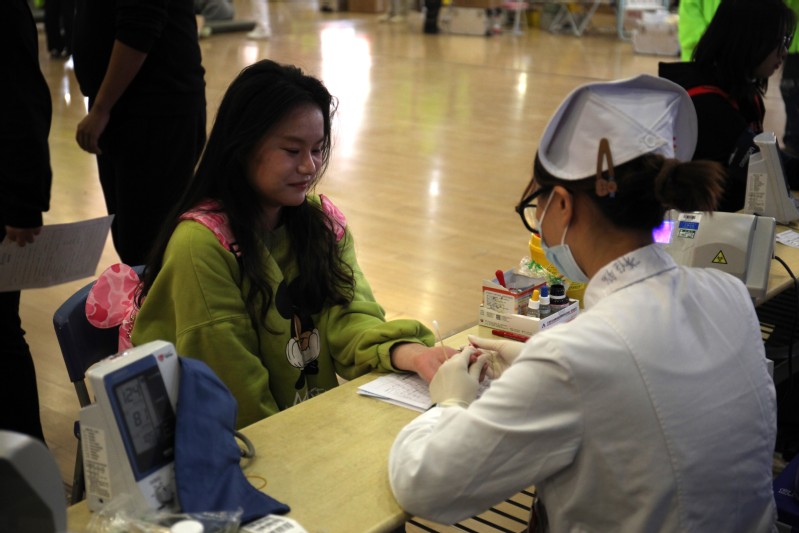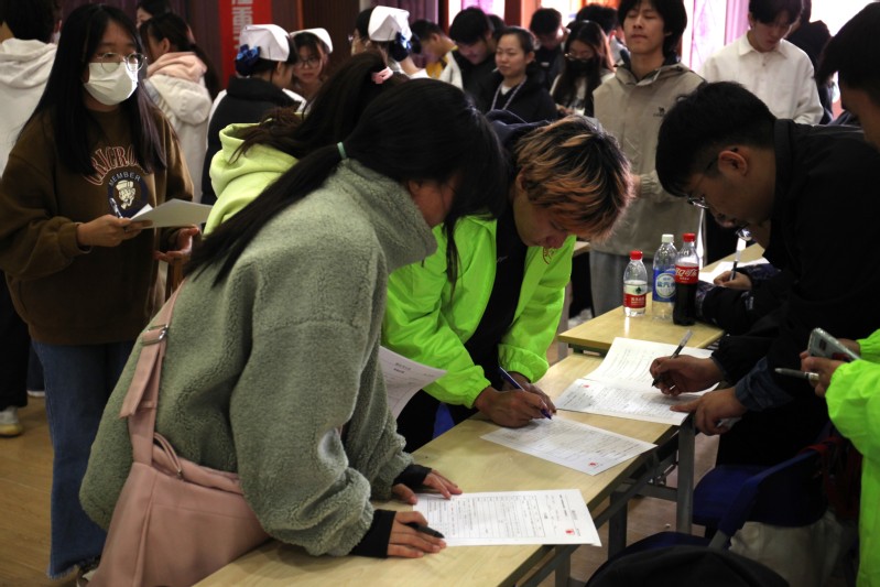 同学们在志愿者的引导下有序进行填表登记、测量血压、体检化验等。我校公共卫生与护理学院的学生积极参与献血,他们作为一名未来的医务工作者,更明白血液对于临床患者的重要意义。22护理6班姚欣雨和朱梦瑶同学接受采访时表示,今年是她们第二次参加献血活动。献血是作为一名大学生应尽的社会责任,希望今后能继续用自己的行动,带动身边人积极参与到献爱心活动中。
