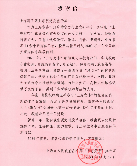 2023年12月27日,市政府办公厅“上海发布”办公室发来《感谢信》。信中提到,2023年,我校积极响应并参与“上海发布”的栏目征集、新媒体产品策划,投送了许多主题鲜明、富有特色的素材,为“上海发布”做好沪上高校宣传推介提供了宝贵的支持。挥手告别2023,未来的日子里,我们将继续积极主动、通力合作,讲好震旦故事,传递震旦声音,助力上海教育事业发展。