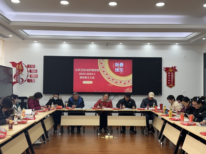 2024年1月16日上午,公共卫生与护理学院召开期末教职工大会,总结2023年度学院的教学、科研等重点工作,谋划2024年度学院的发展规划,并布置2024年度工作重难点以及其他相关事项。学院院长胡守忠、副院长胡鹏飞、任课老师和辅导员等参加了会议。会议由学院党总支书记王璐主持。