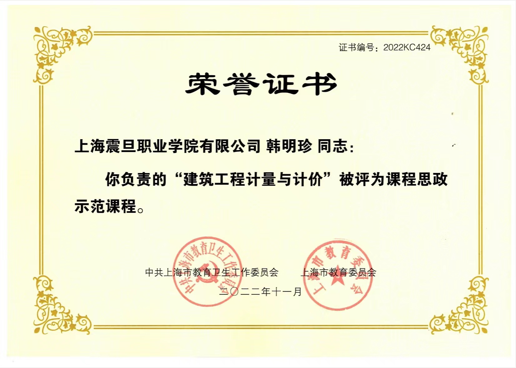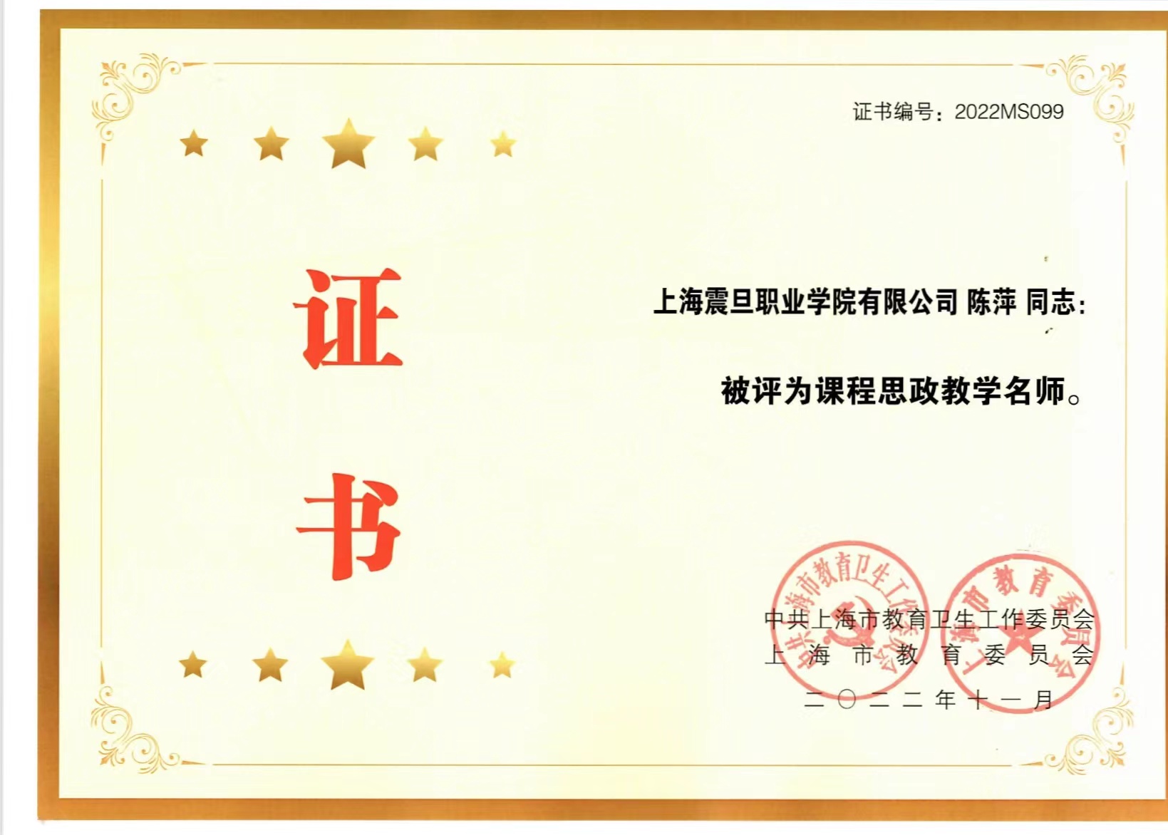 2022年上海市教卫委、上海教委开展“上海学校课程成思政建设提升行动”,学校智能工程学院教师陈萍荣获上海市课程思政教学名师称号,这是上海民办高校中唯一获此称号的教师;另有4门课获上海市课程思政示范课程;“建筑工程计量与计价”课程教学团队获示范团队。