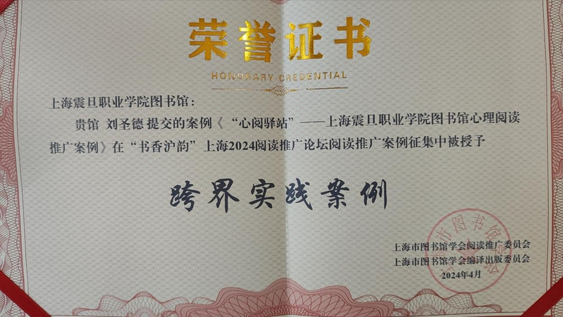 2024年4月3日上午,为宣传图书馆全民阅读的最佳实践,总结和分享阅读推广的经验和成果,推动图书馆界在阅读推广领域的交流与合作,积极推进书香社会建设,由上海市图书馆学会阅读推广委员会和编译出版委员会共同主办的“书香沪韵”——2024上海阅读推广论坛暨上海市图书馆学会阅读推广委员会成立十周年研讨会在上海外国语大学顺利举行。会上,震旦职业学院图书馆刘圣德老师申报的《“心阅驿站”——震旦职业学院图书馆心理阅读推广案例》在众多阅读推广案例中脱颖而出,获得“跨界实践案例”奖。