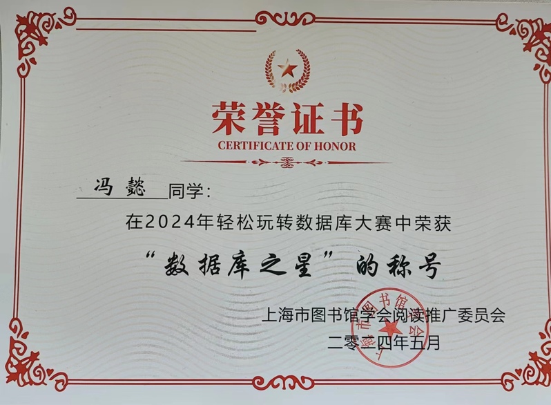 为满足图书馆对数字资源的推广需求,让更多学生了解学校图书馆优质的数字馆藏资源及正确的使用方法,提高图书馆数字资源利用率,激发读者使用兴趣,为图书馆数字化的发展助力,上海市图书馆开展“轻松玩转数据库”阅读推广活动,我校公共卫生与护理学院23级护理1班冯懿同学荣获“数据库之星”称号。